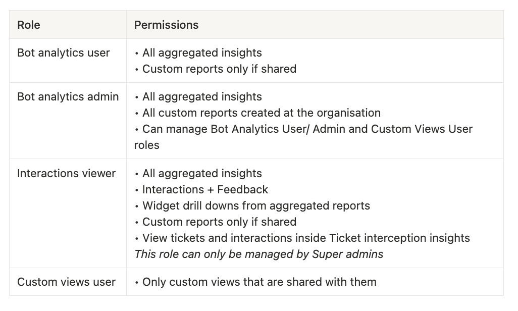 Bot Analytics Admin / Bot analytics user / Interactions viewer / Super admin