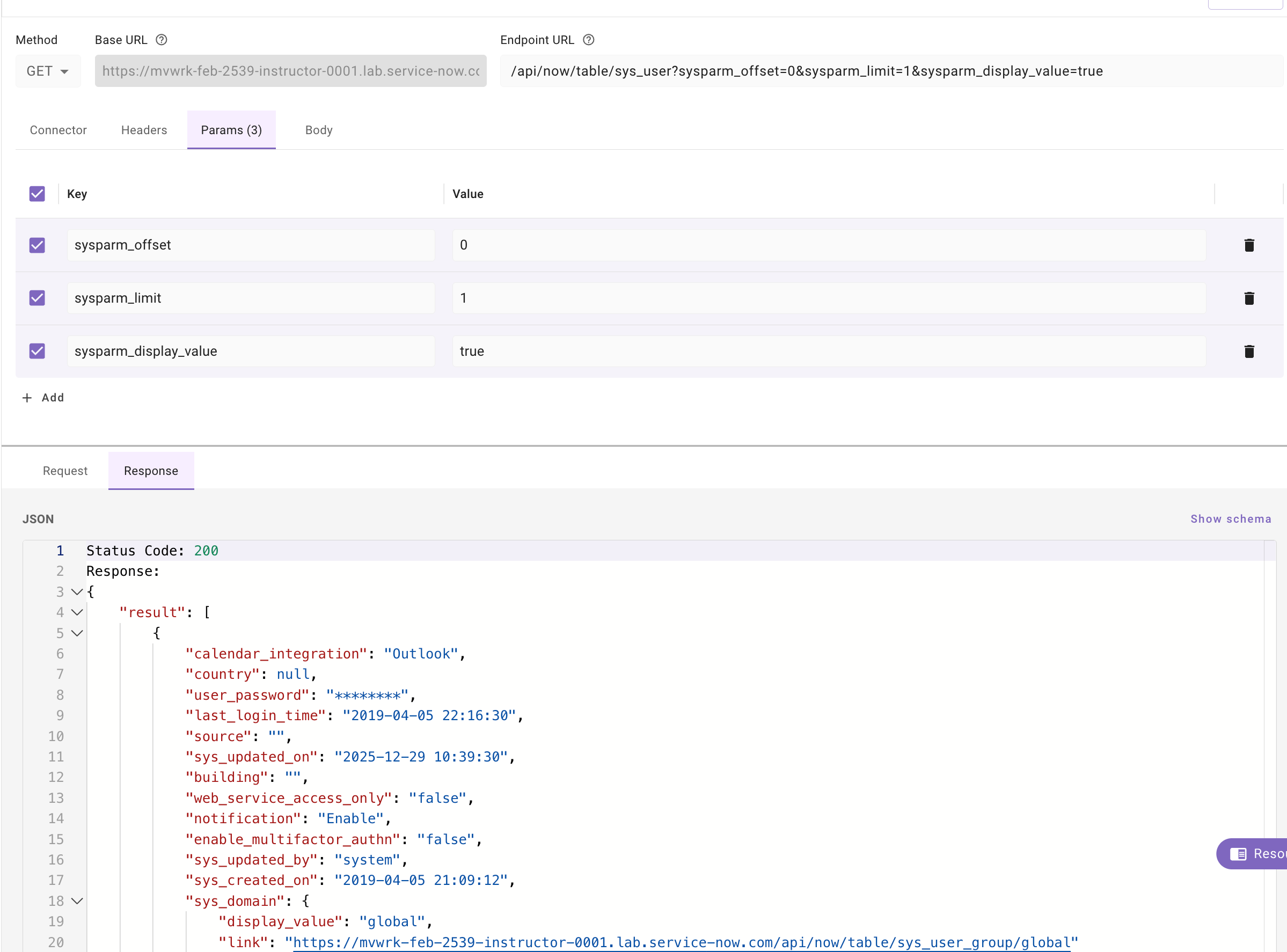 Note: Your response object will not have the exact same values as shown in the screenshot. The purpose of this step is to confirm that you are able to successfully do a GET call to the user table within your connected NOW instance
