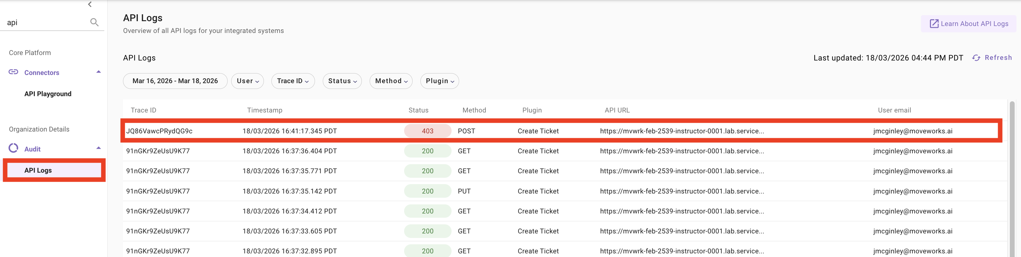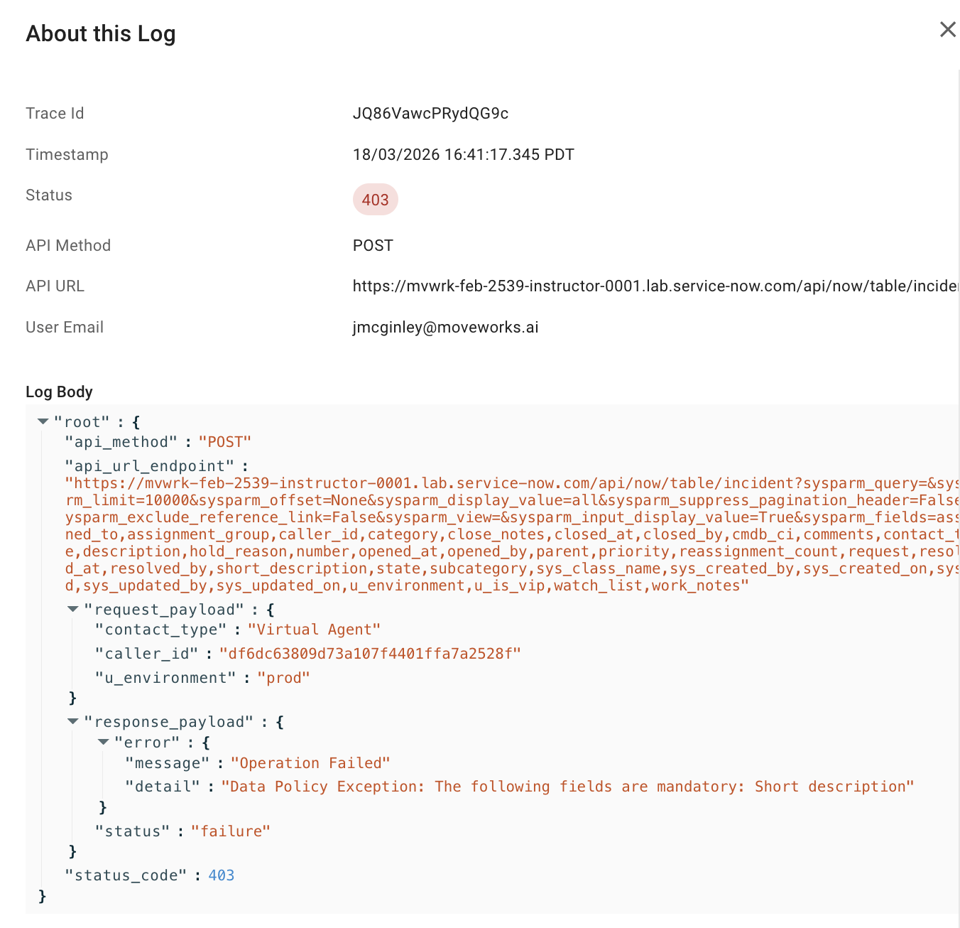 Within Moveworks Setup, we can check the API Logs module to see what Moveworks tried to send to the endpoint system and how it failed.