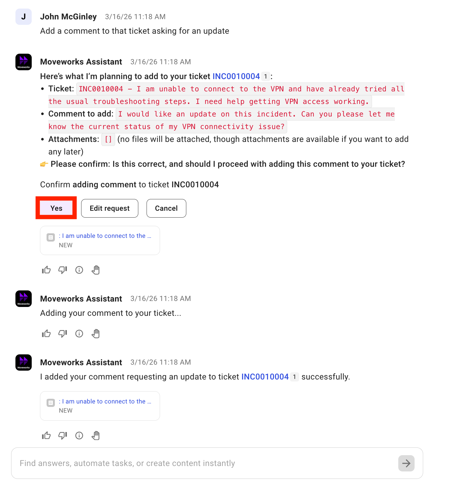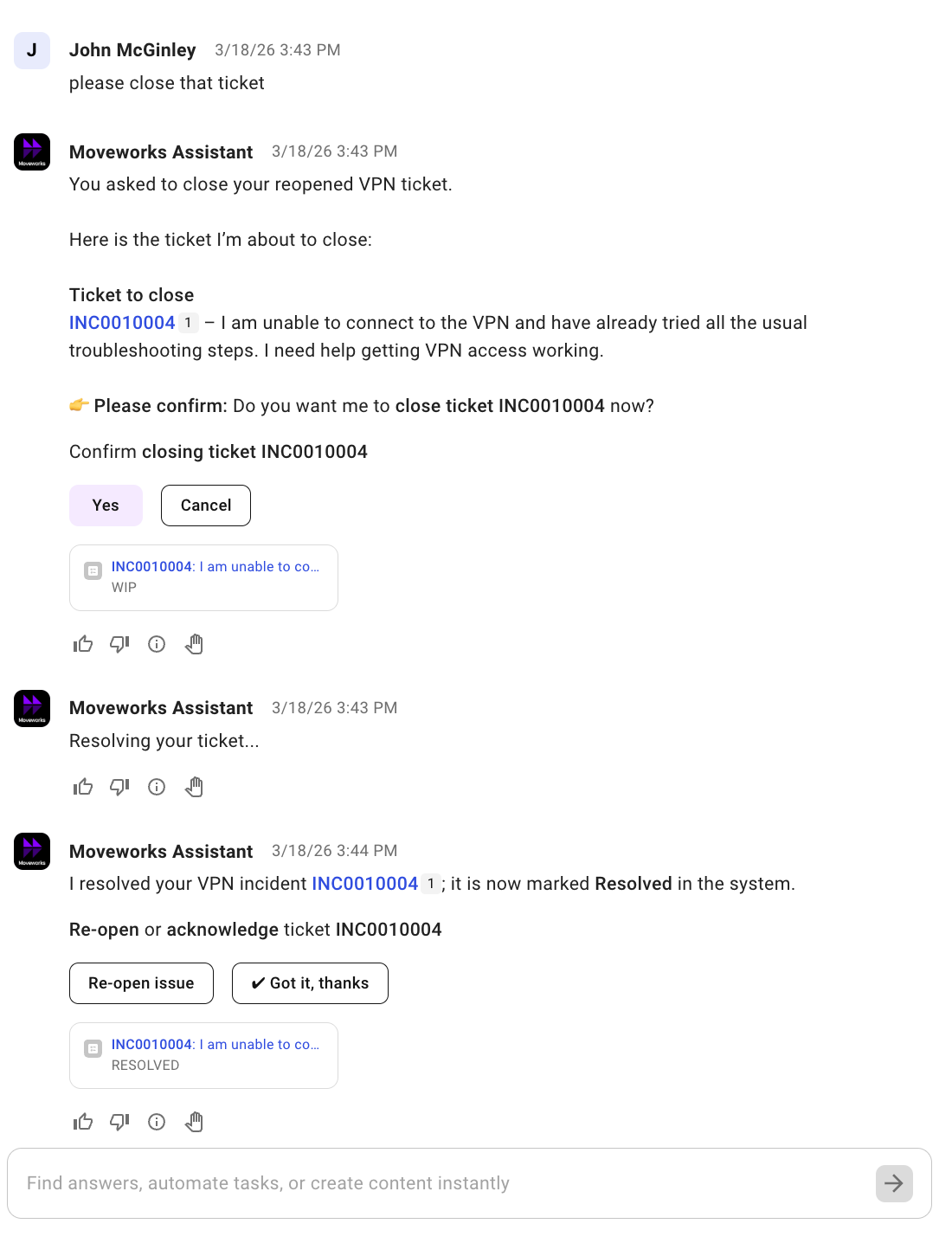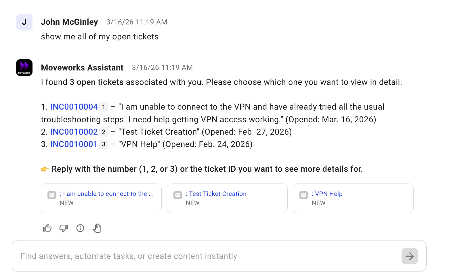 - Check Success: Talk to Moveworks! Confirm you are able to do the following ticket actions: