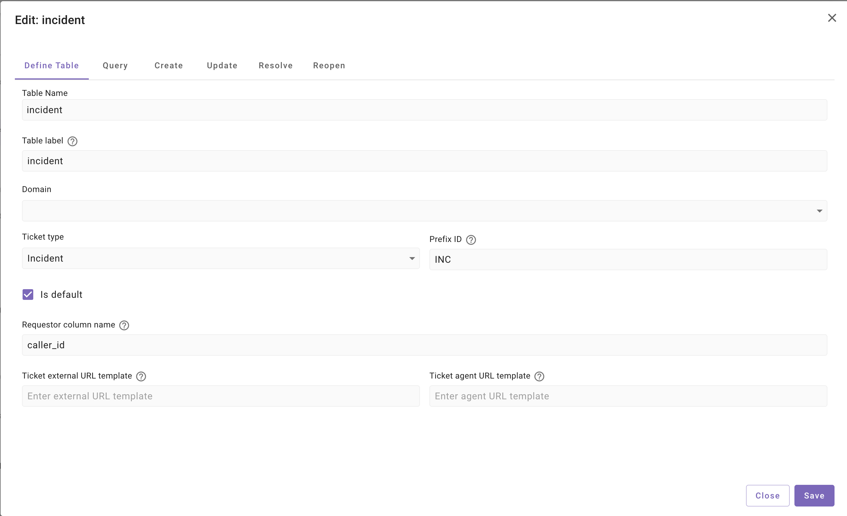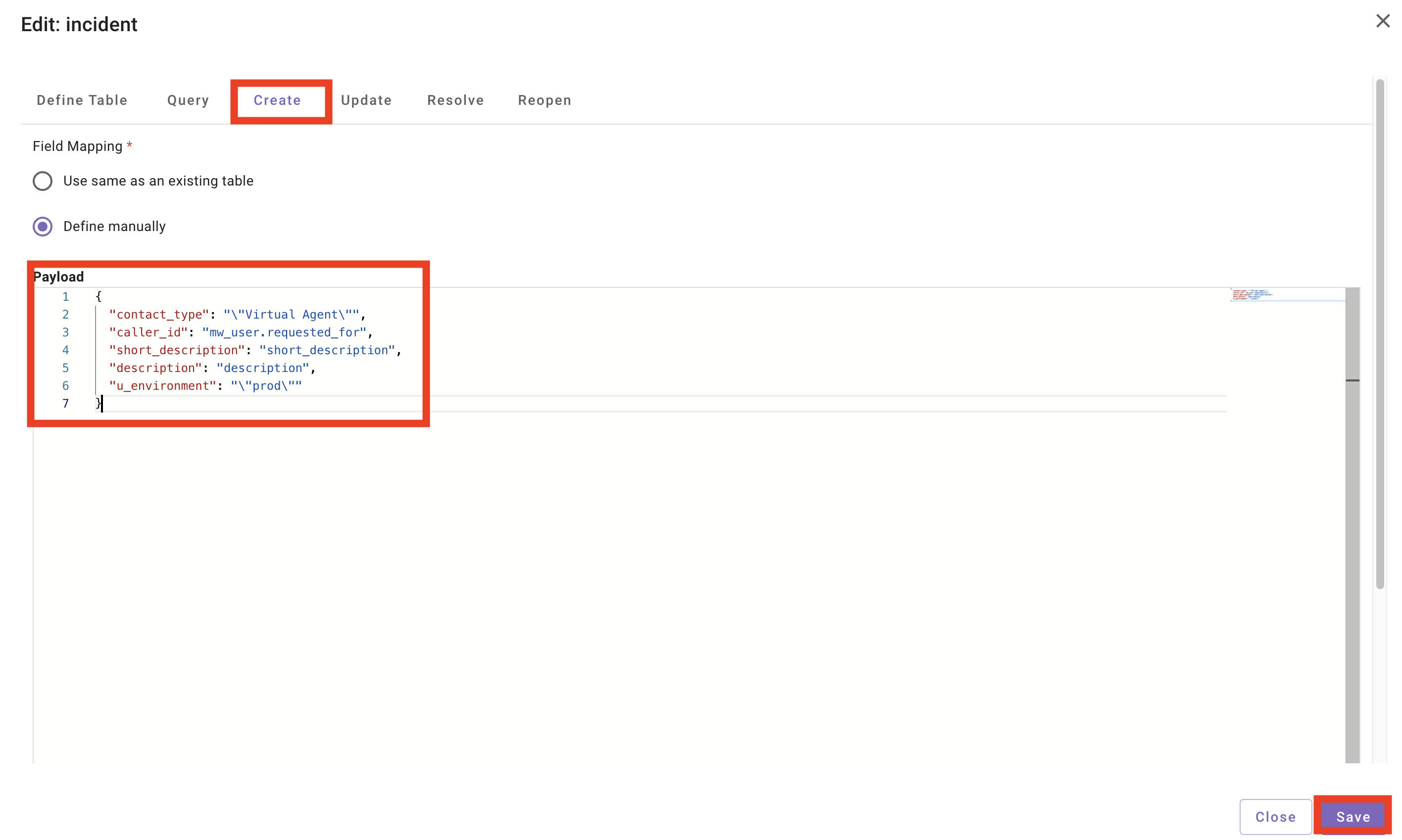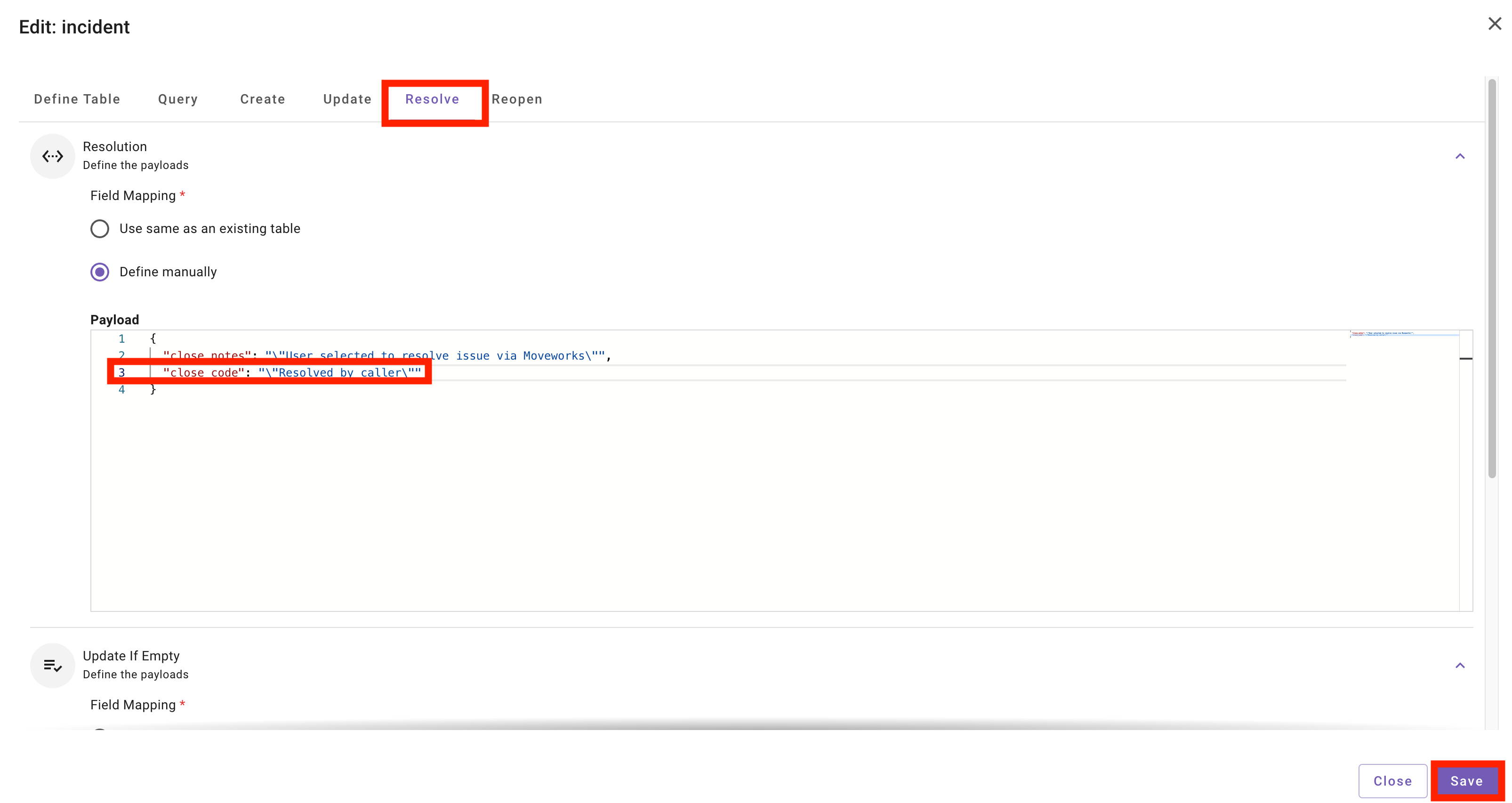 Resolvetable, and update theclose_codefield that Moveworks will write to ServiceNow. Be sure toSave:"close_code": "\"Resolved by caller\""