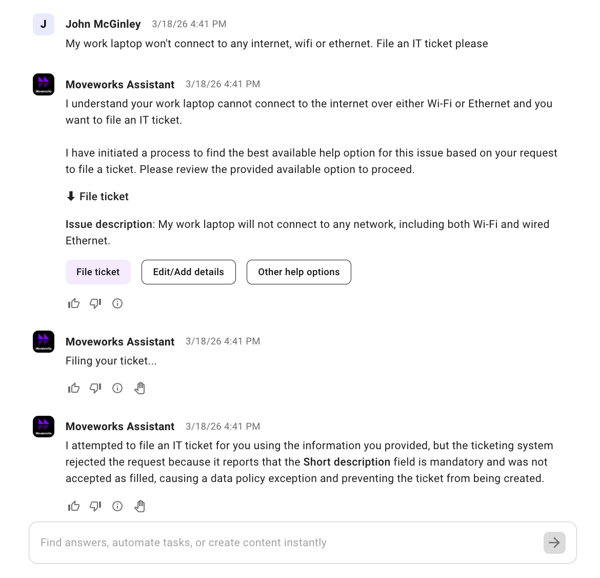 If the Assistant fails in a communication to the ticketing platform, it will state to the end-user that it failed to take the requested action.