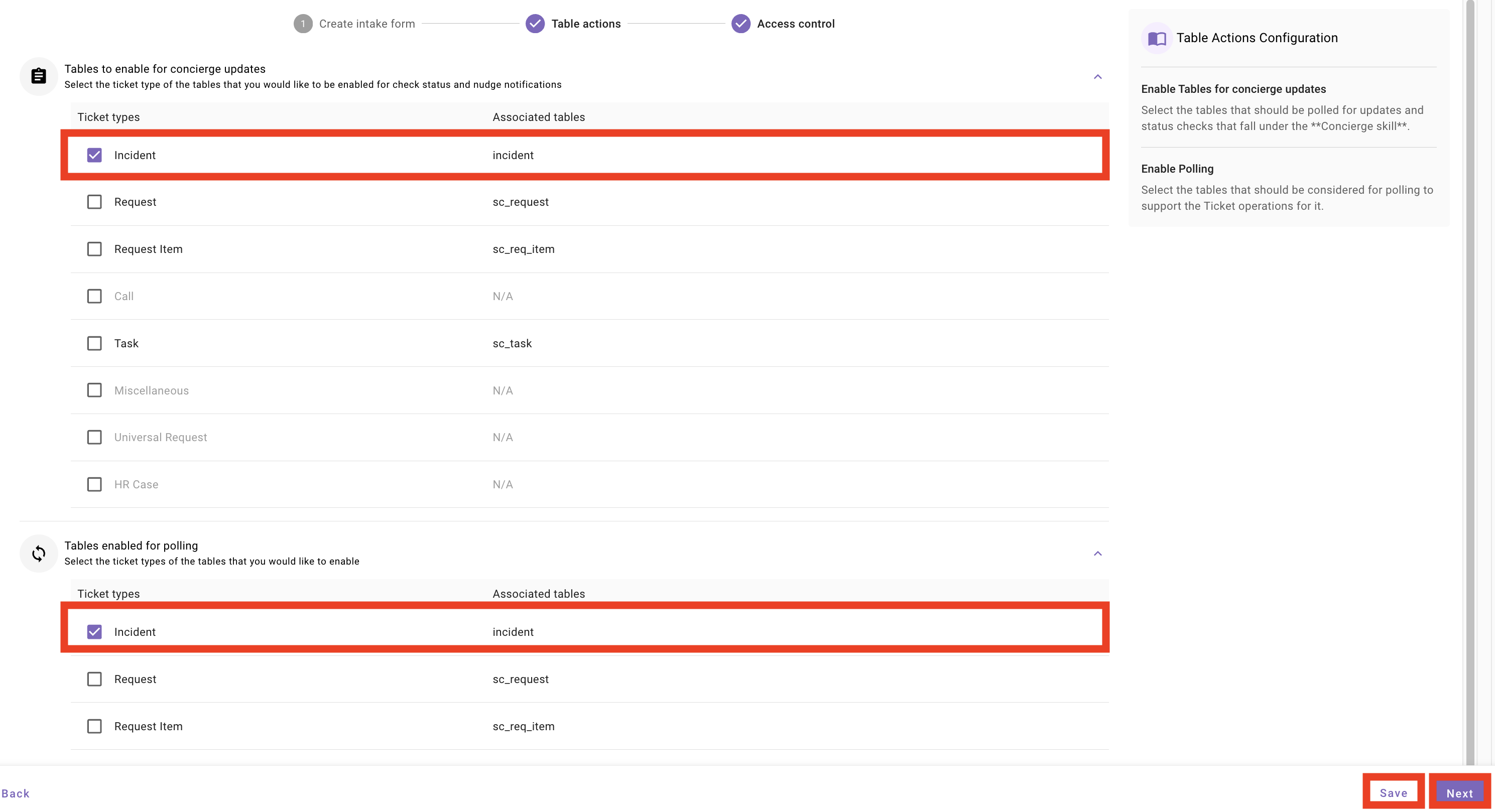 Table Actionsand confirm that theIncidentticket type is enabled for Polling and Concierge Updates. Ensure you clickSavebefore moving on
