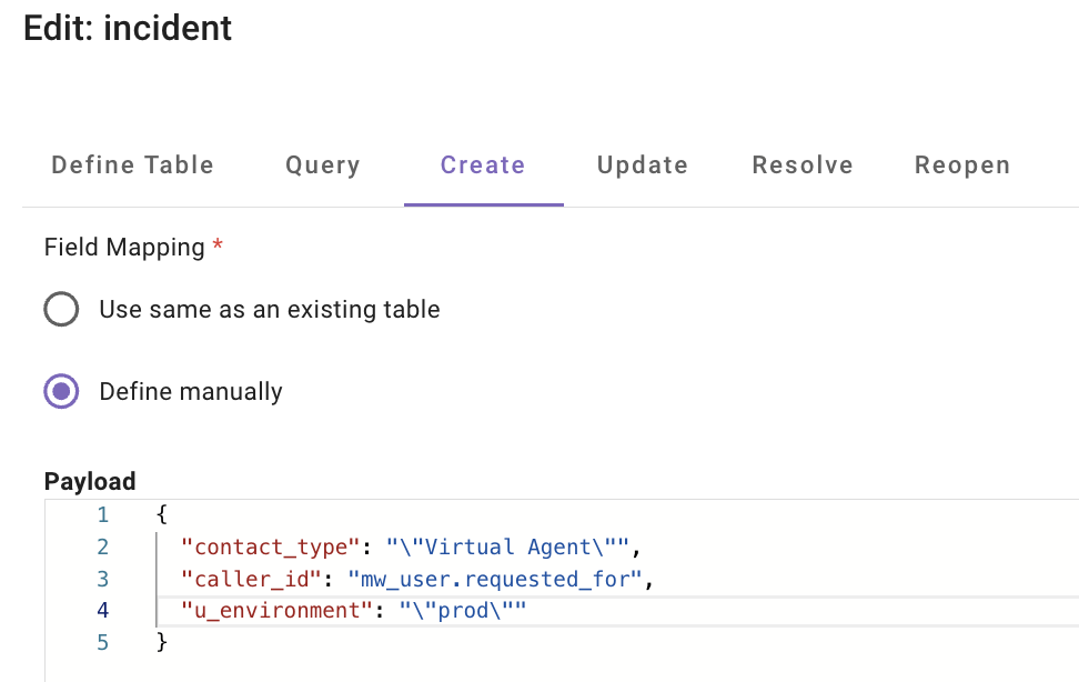 Note: When configuring WRITE tables (Create, Update, Resolve, Reopen), the formatting tells Moveworks whether to use a fixed value or a variable you’ve already defined in your query configuration.