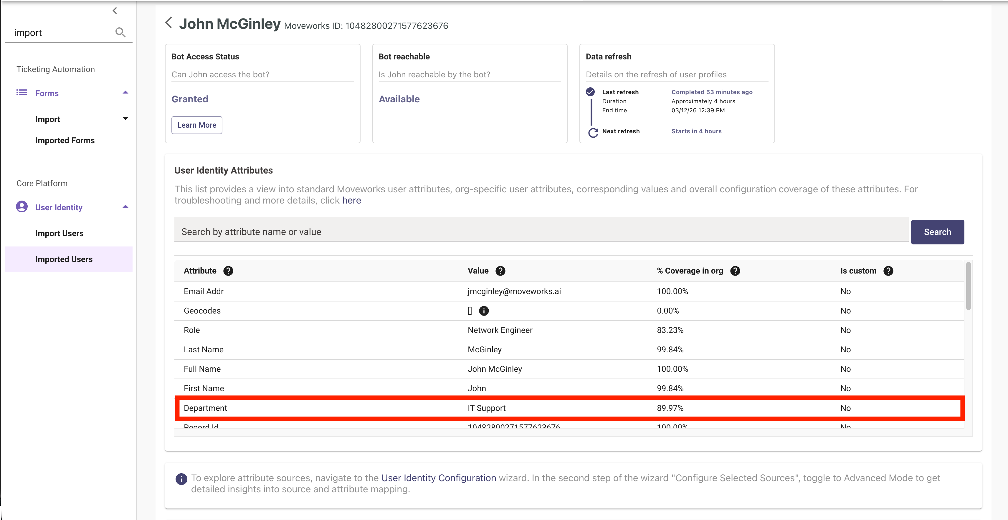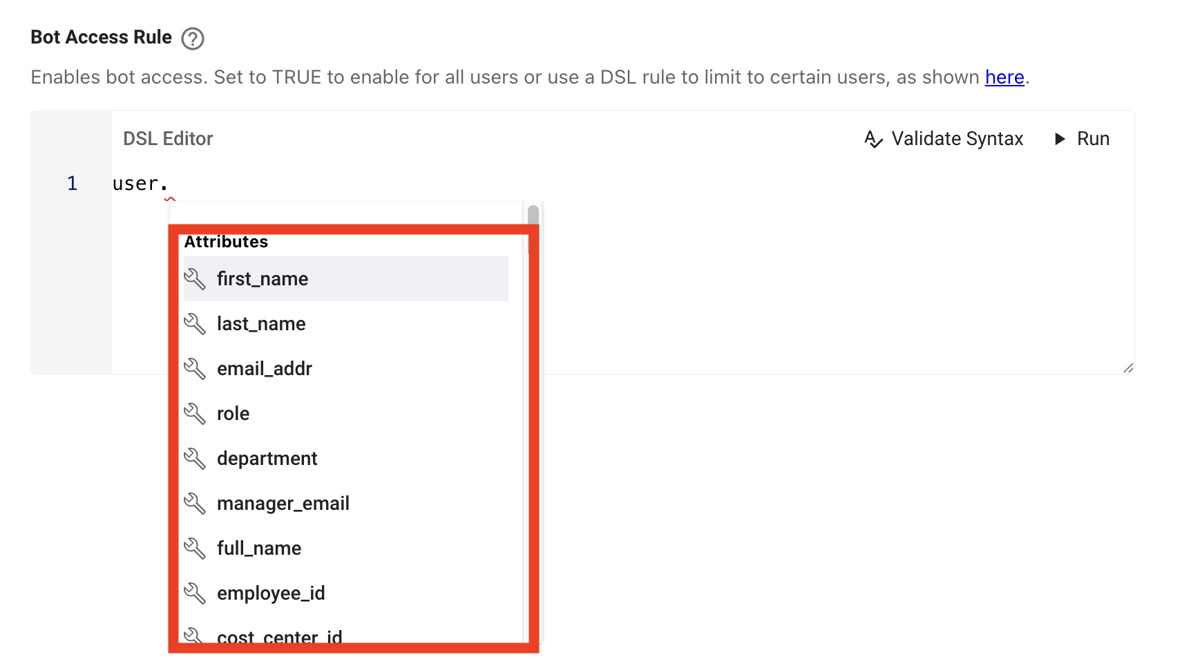 Before writing rules, verify the field’s coverage for your organization. In the following example, if an administrator were to limit bot access by the “Department” field, they must be aware that 10.03% of the users lack this attribute and would be excluded by default.