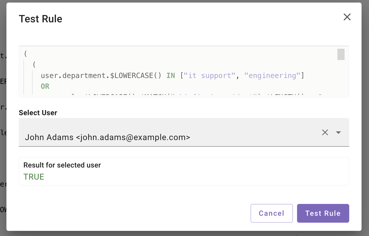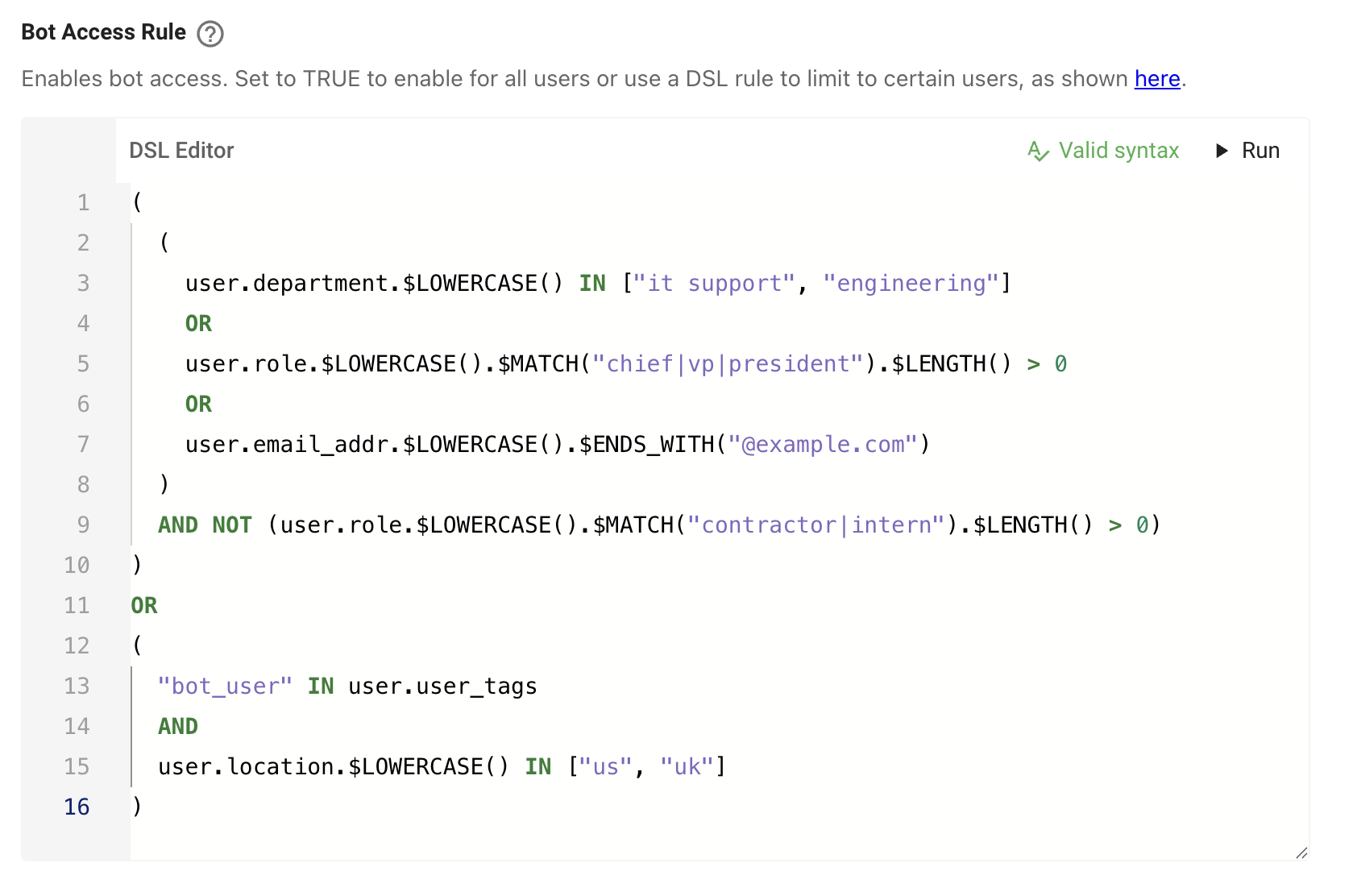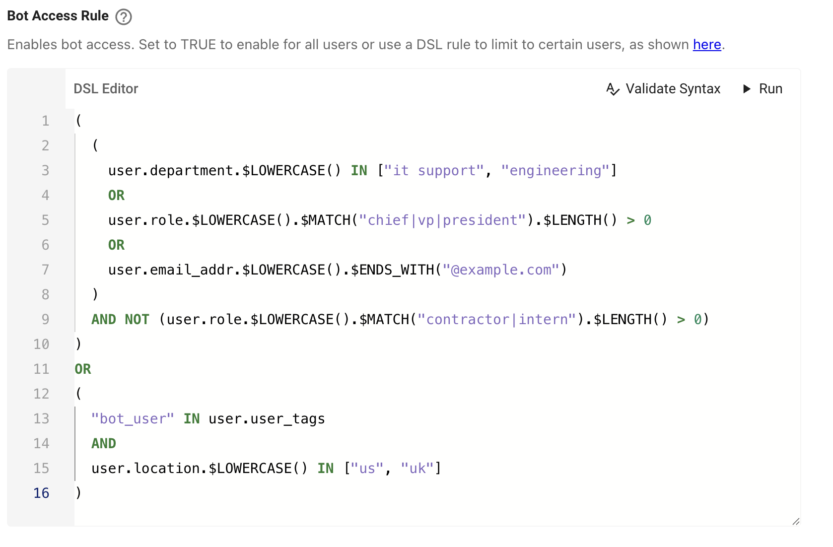6. We can add several different layers of DSL logic by combining operators. As long as an attribute is being ingested on the Moveworks User or Ticket object, you can build an access rule around it! Try adding the below block to see a combination of fields, case normalization, operator combination, and comparisons
