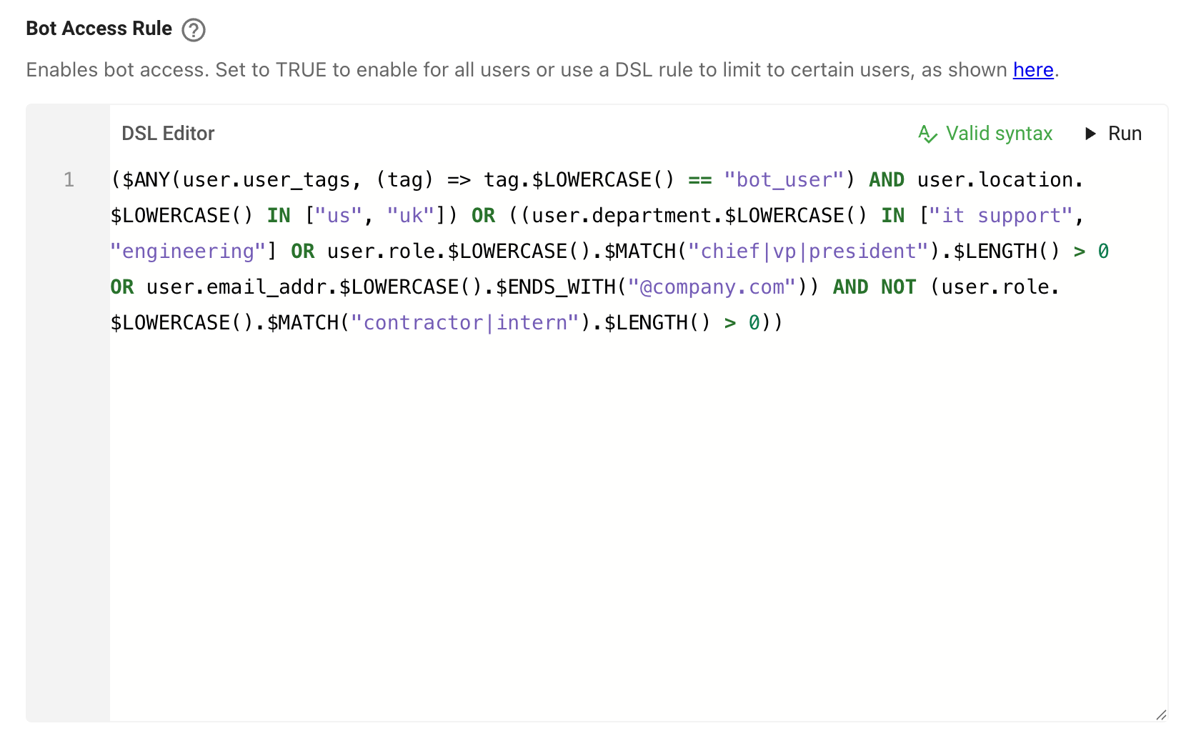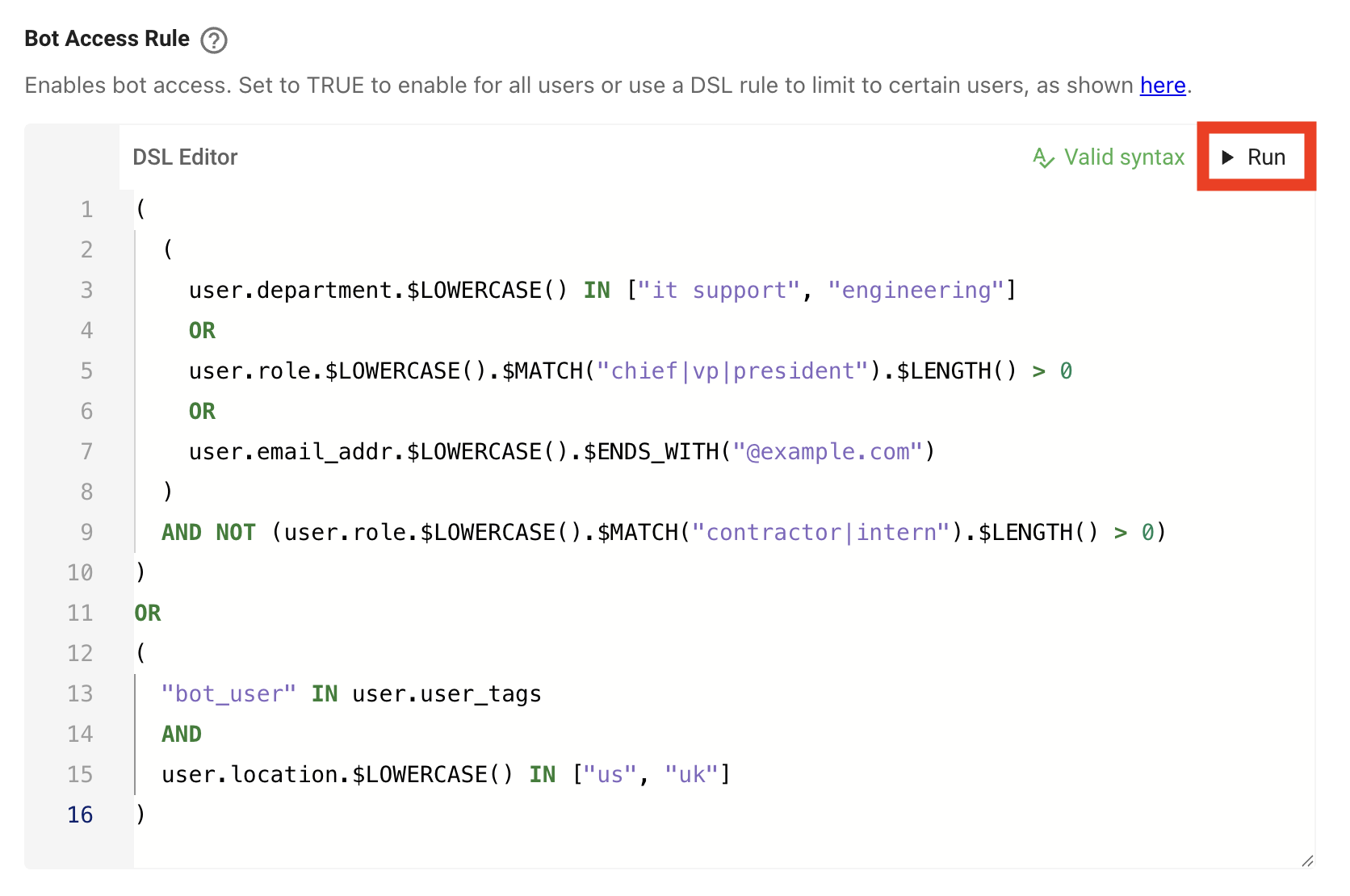 b. Select Run to compare your DSL rule against a user or ticket which you know should pass & fail, and confirm your rule is working as expected