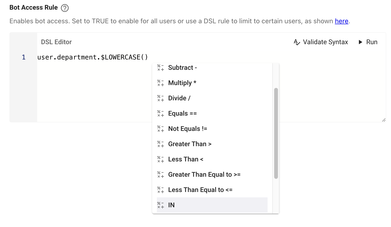 INwhen comparing a single attribute against multiple allowed values (e.g.,user.department.$LOWERCASE() IN ["it support", "engineering"]). Use==for a single exact match.