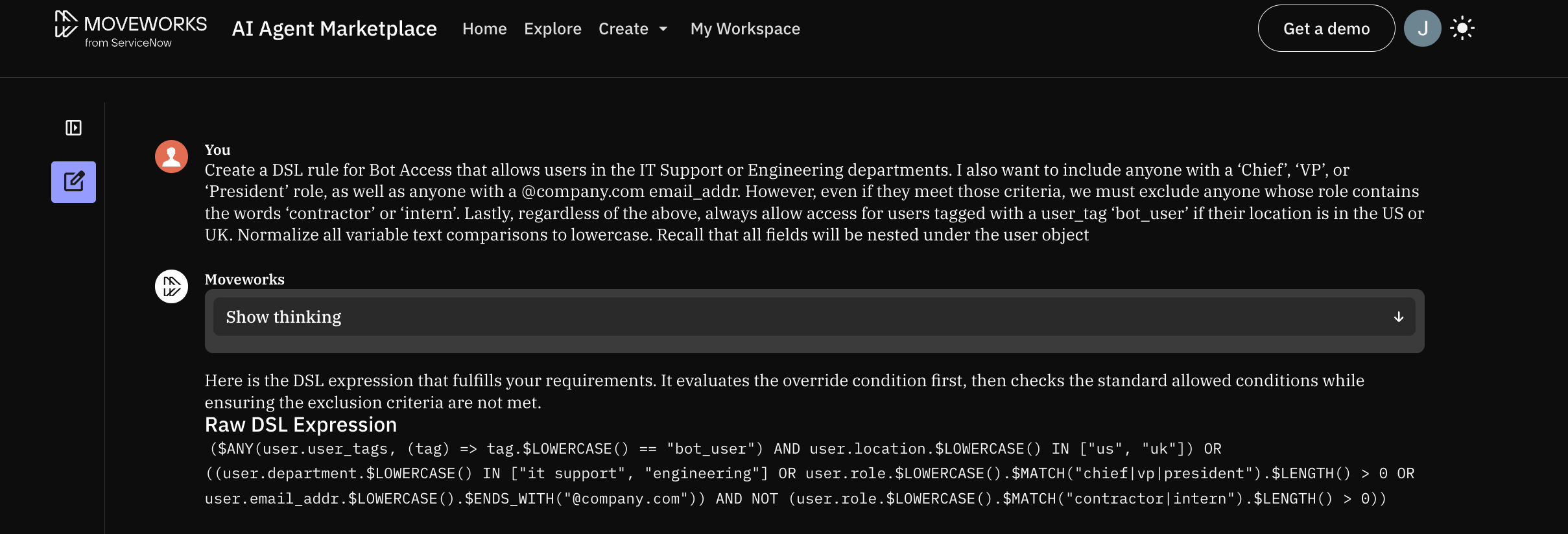 Use the Moveworks DSL Architect when trying to create complex DSL rules to restrict access. The architect allows you to turn natural language requirements into ready-to-use DSL code. Simply describe who should (or shouldn’t) have access, and the Architect will handle the nesting, methods, and operators for you.