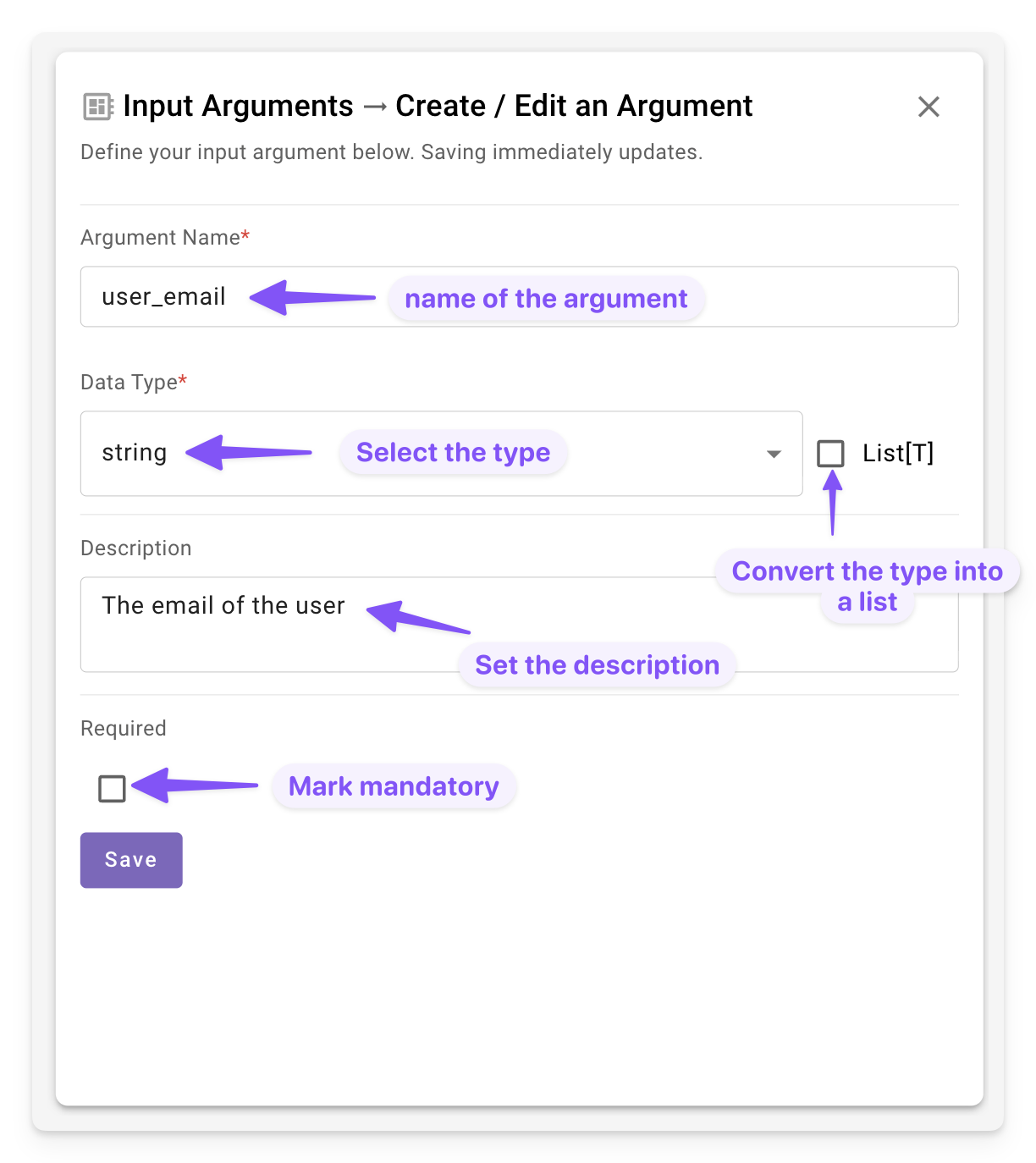 For custom actions (HTTP, script, and compound), input arguments are defined in the action's configuration, typically by specifying the argument's name and data type.