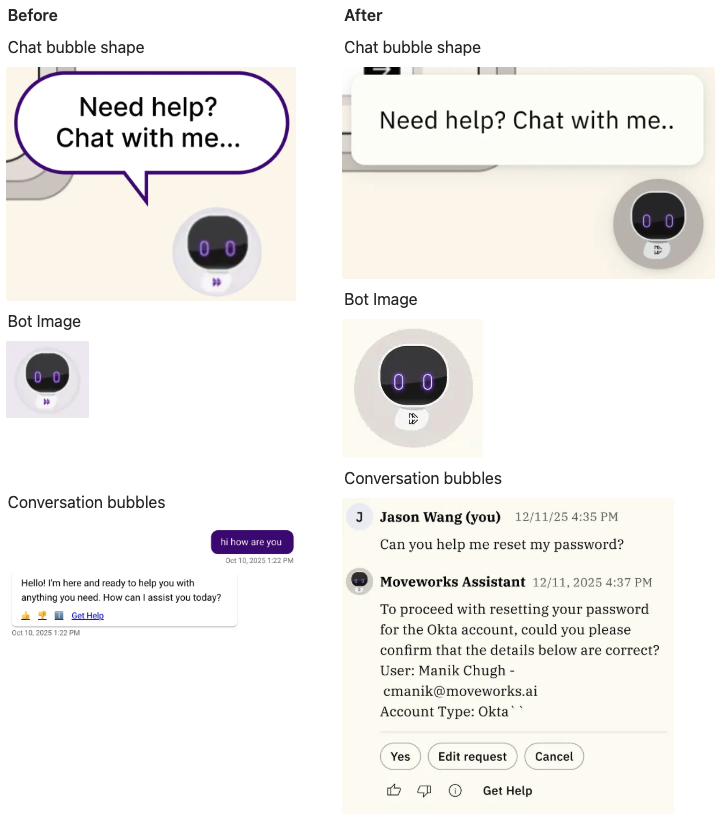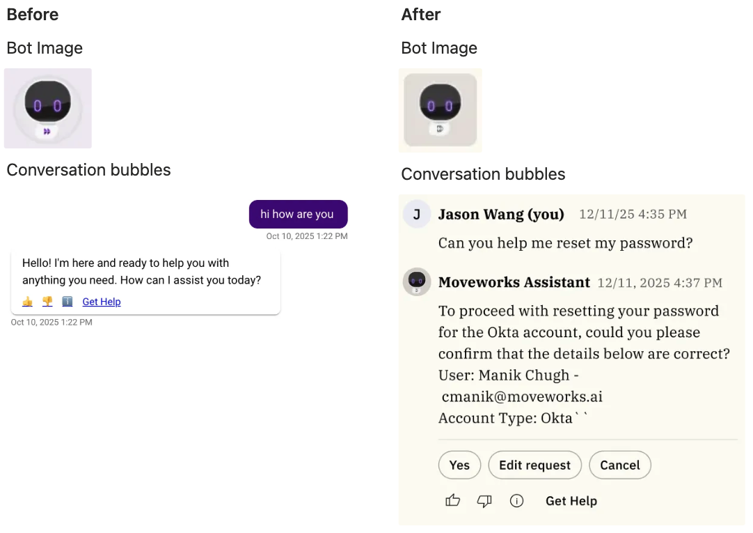 Assistant on Web will adopt the new Moveworks look and feel, including:
