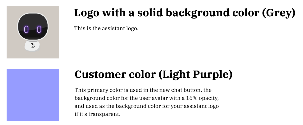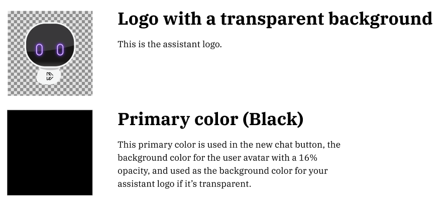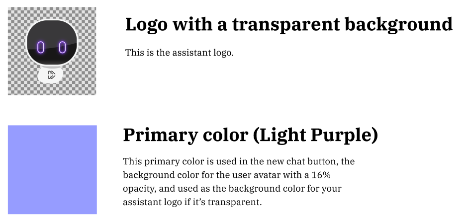 - Primary color (gets applied as the background color for the “new chat thread” button on assistant on web, the background color for the user avatar that appears on all web experiences, and as the background color to your bot image assuming your bot image was a logo with a transparent background).