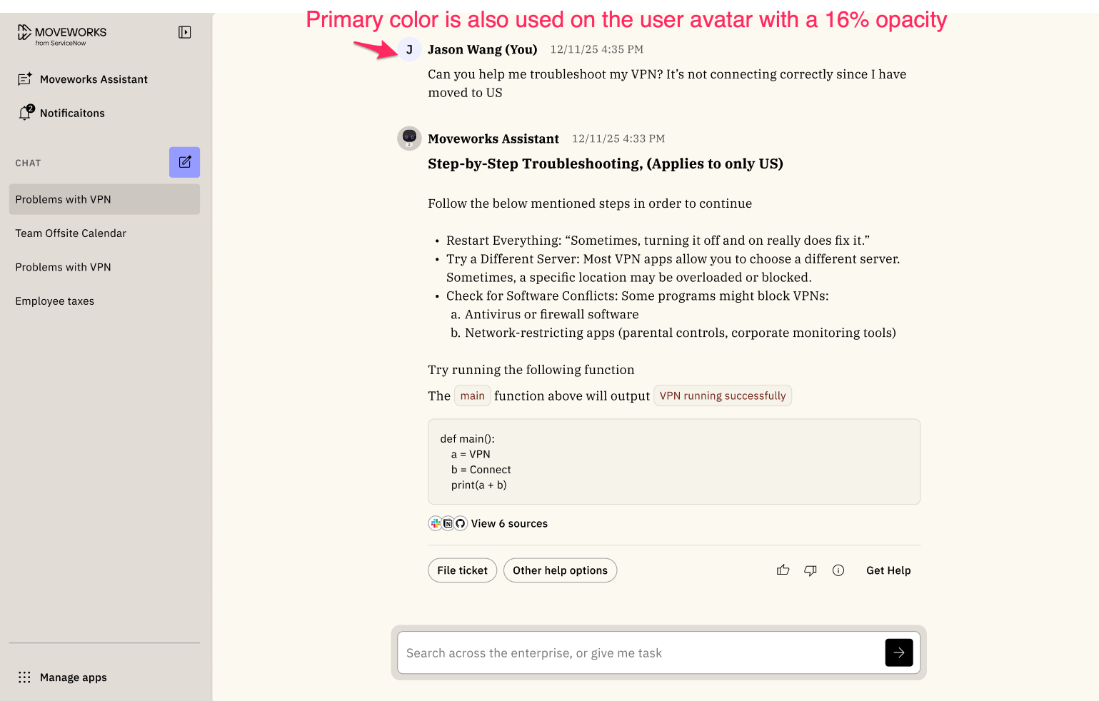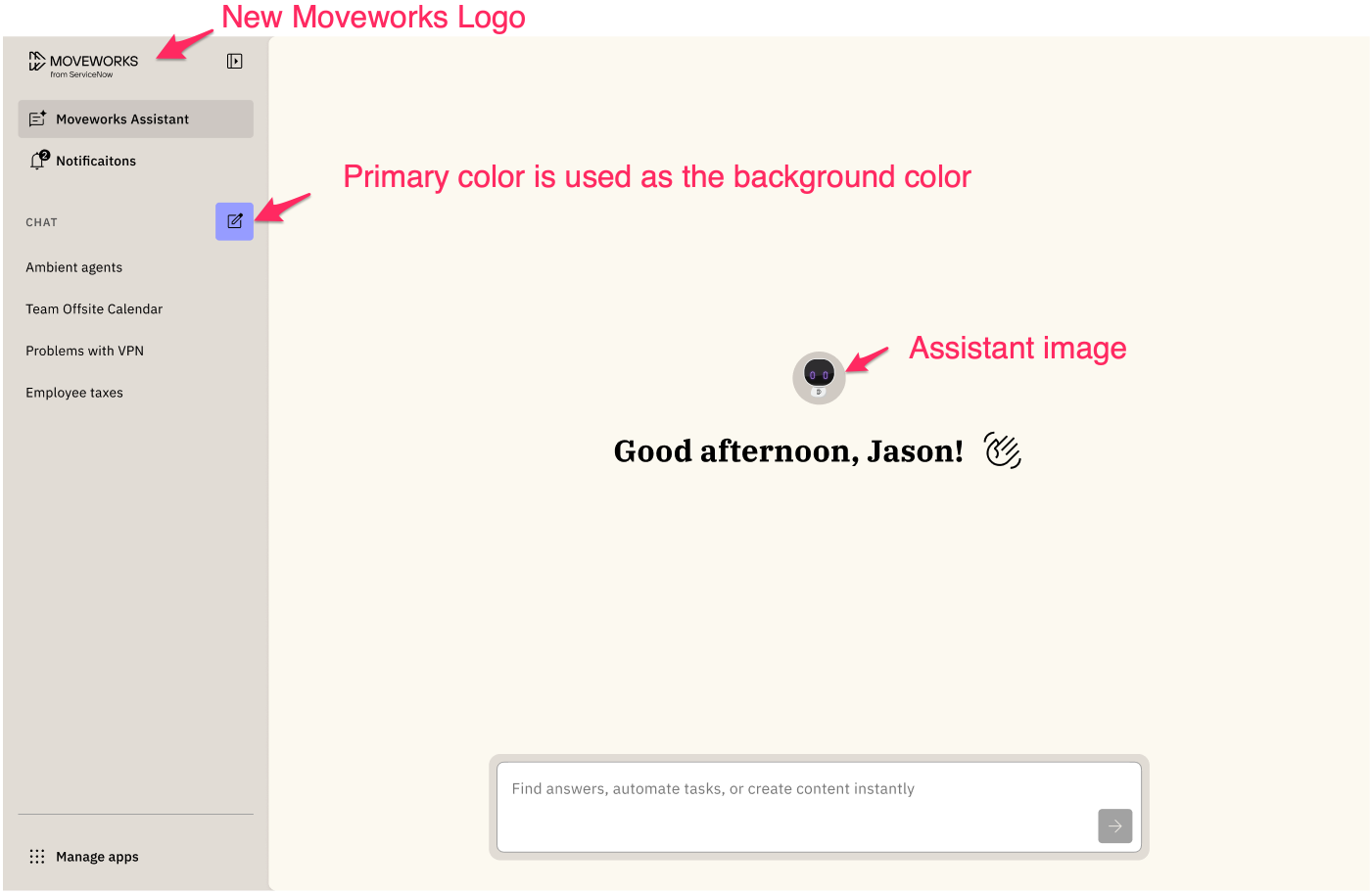 You'll see an updated Moveworks logo since now we're part of Service Now, "Moveworks from ServiceNow". Your assistant name and logo will continue to be displayed. You'll notice this example is using light purple as the primary color.
