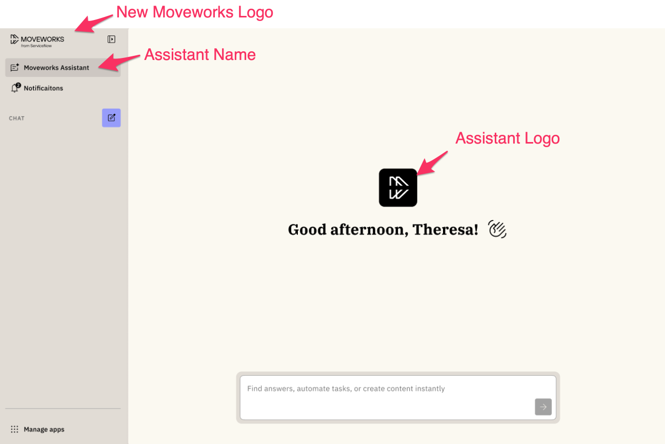 You'll see an updated Moveworks logo since now we're part of Service Now, "Moveworks from ServiceNow". Your assistant name and logo will continue to be displayed.