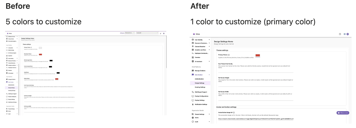 Today you can configure 5 different colors (Primary color, Secondary Theme, Bot message Theme, User message theme, and Card Theme). With this update, we will only support primary color moving forward.