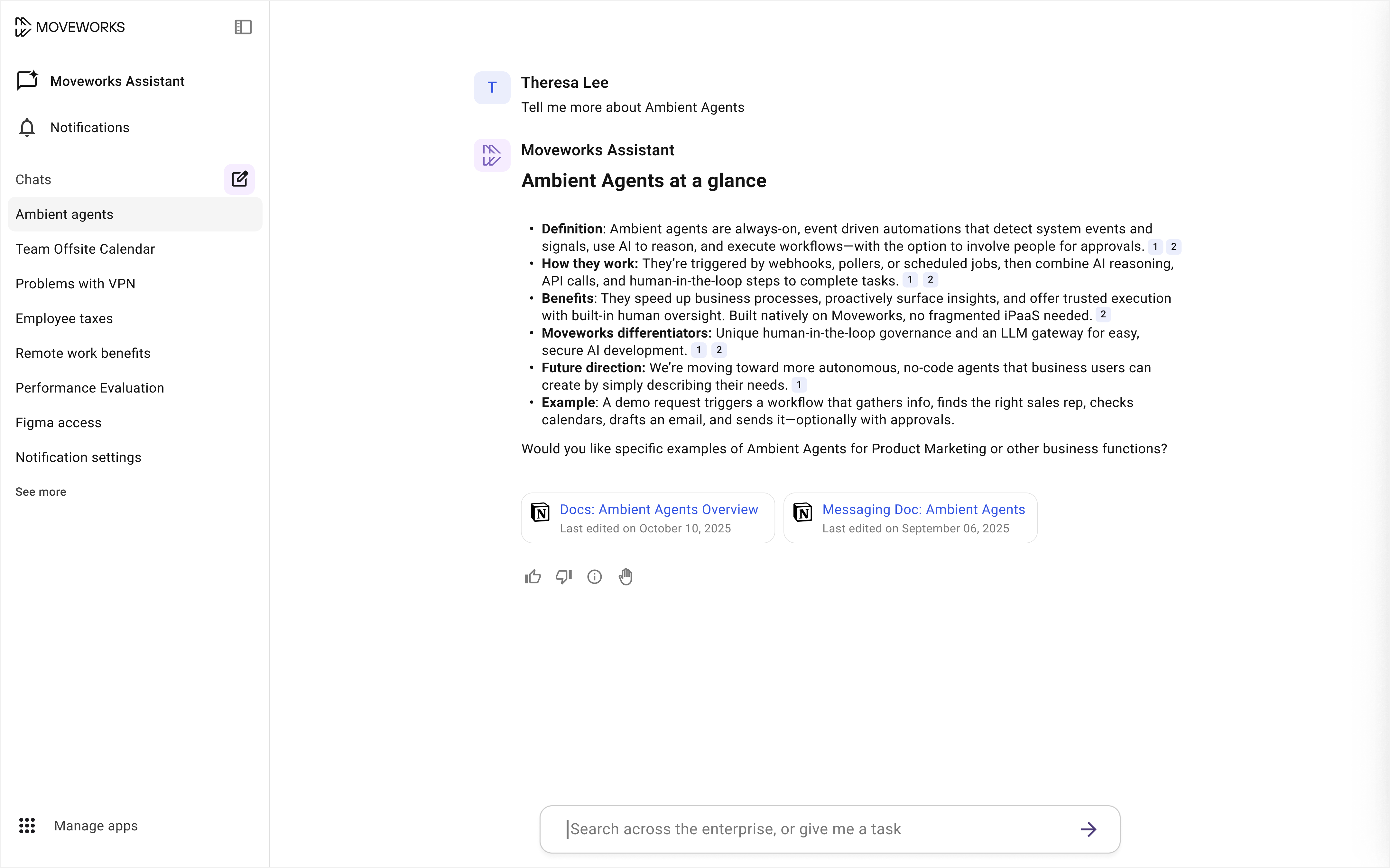 Employees spend most of their day working in the browser, and Assistant on Web brings the full power of Moveworks right into that flow. It’s the center of work — the place where employees can find information, complete tasks, and collaborate without switching tools or losing focus.