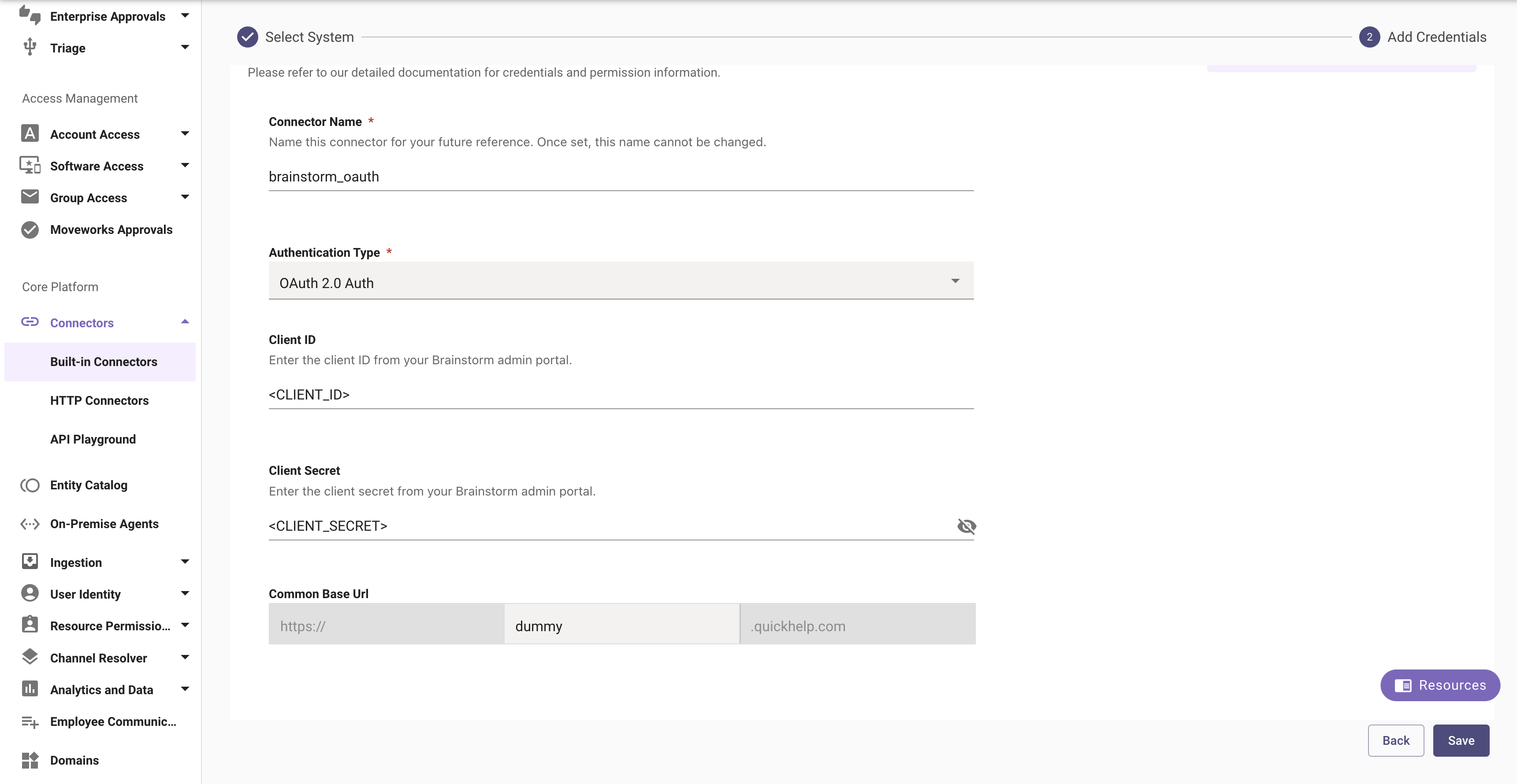 Navigate to Core Platform > Connectors > Built-In Connectors and create a new connector. Select Brainstorm and enter the information below:
