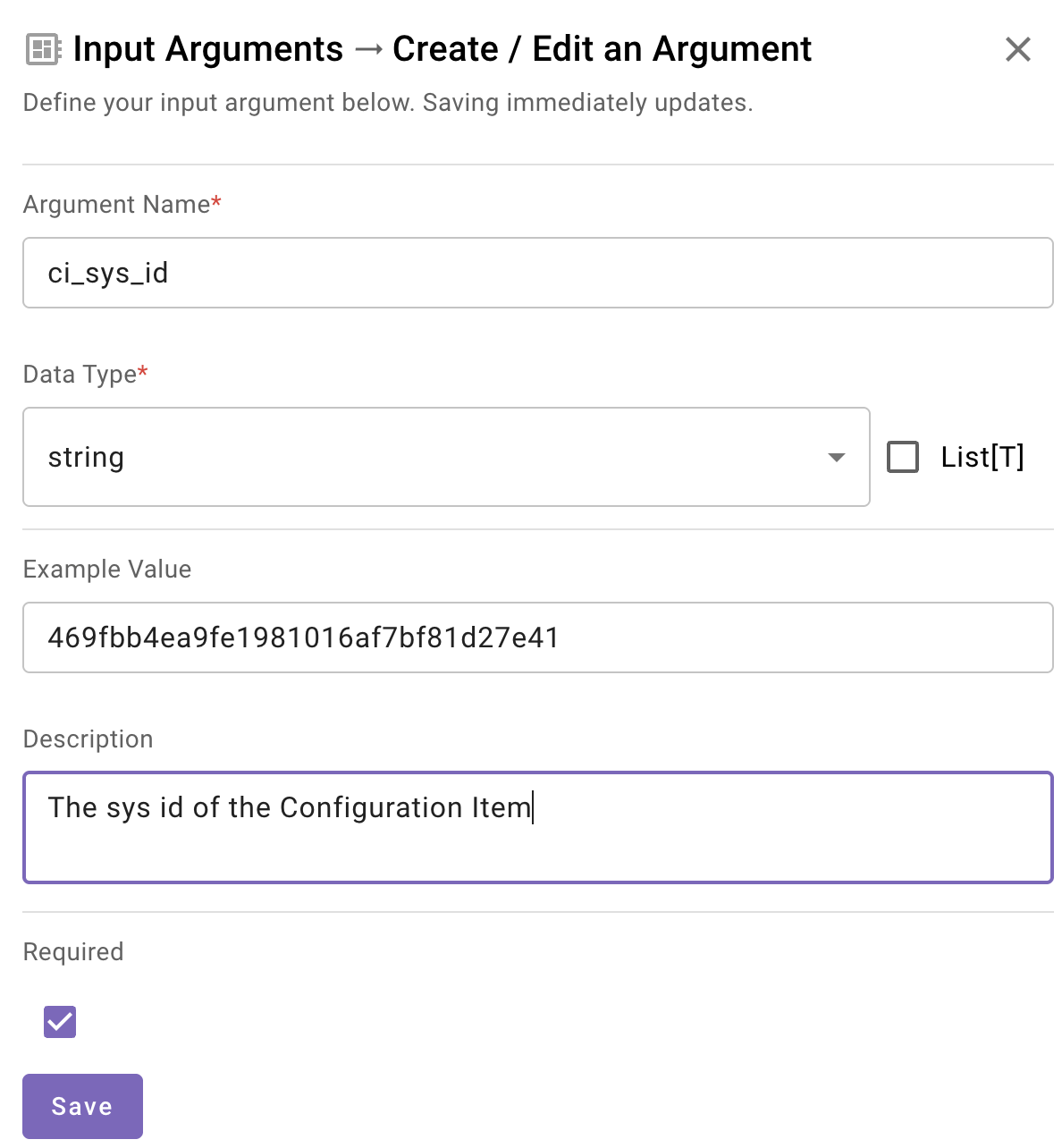Let's populate the ci_sys_id input argument and test the API call. Click the pencil icon to open it up. Provide an example of a ci_sys_id - for testing purposes you can use 469fbb4ea9fe1981016af7bf81d27e41. Remember to make sure you fill in the description and check the "Required" box and click"Save". The description is important since it tells Moveworks how to ask for this argument.