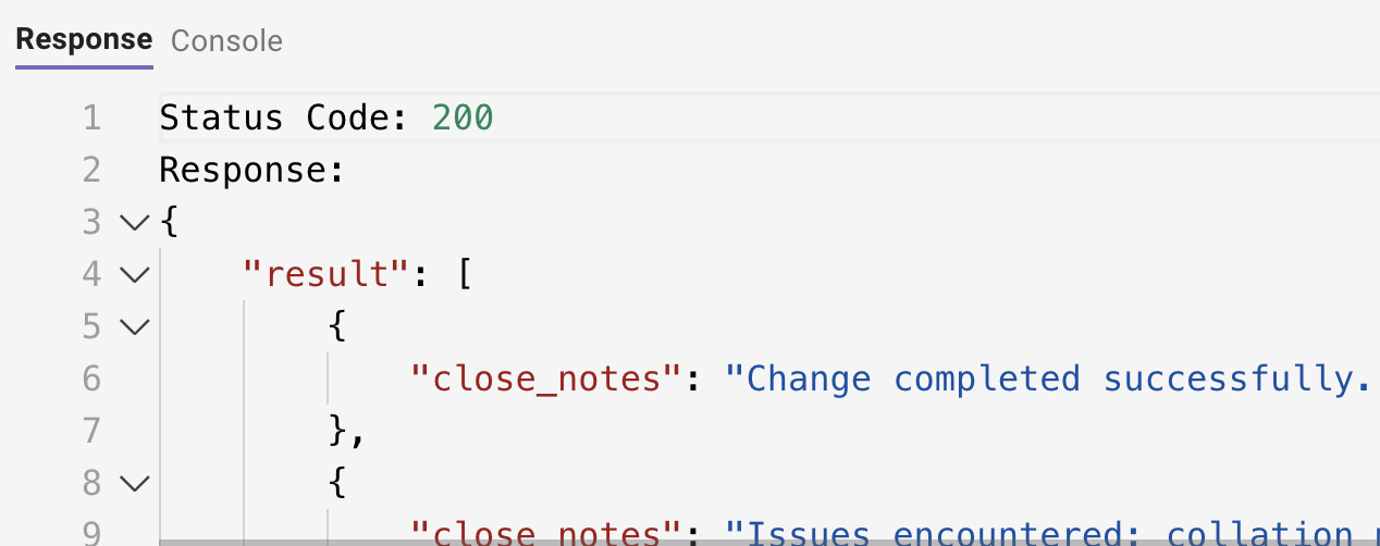 - Click the TEST button. At the bottom in the Console you should see a 200 with a response that looks something like screenshot below. NOTE: Typically this API call would return a lot of information we don't need, essentially everything about the Change Request. We are leveraging the ServiceNow Encoded Query syntax since we only need the close notes for our purposes.