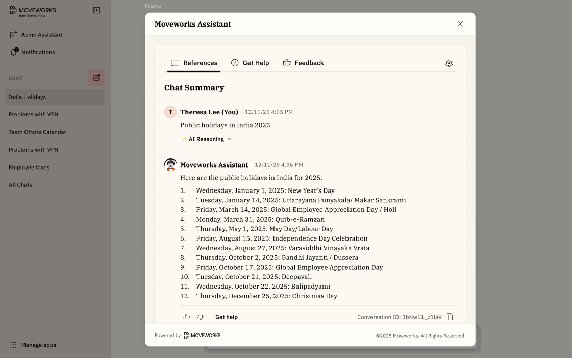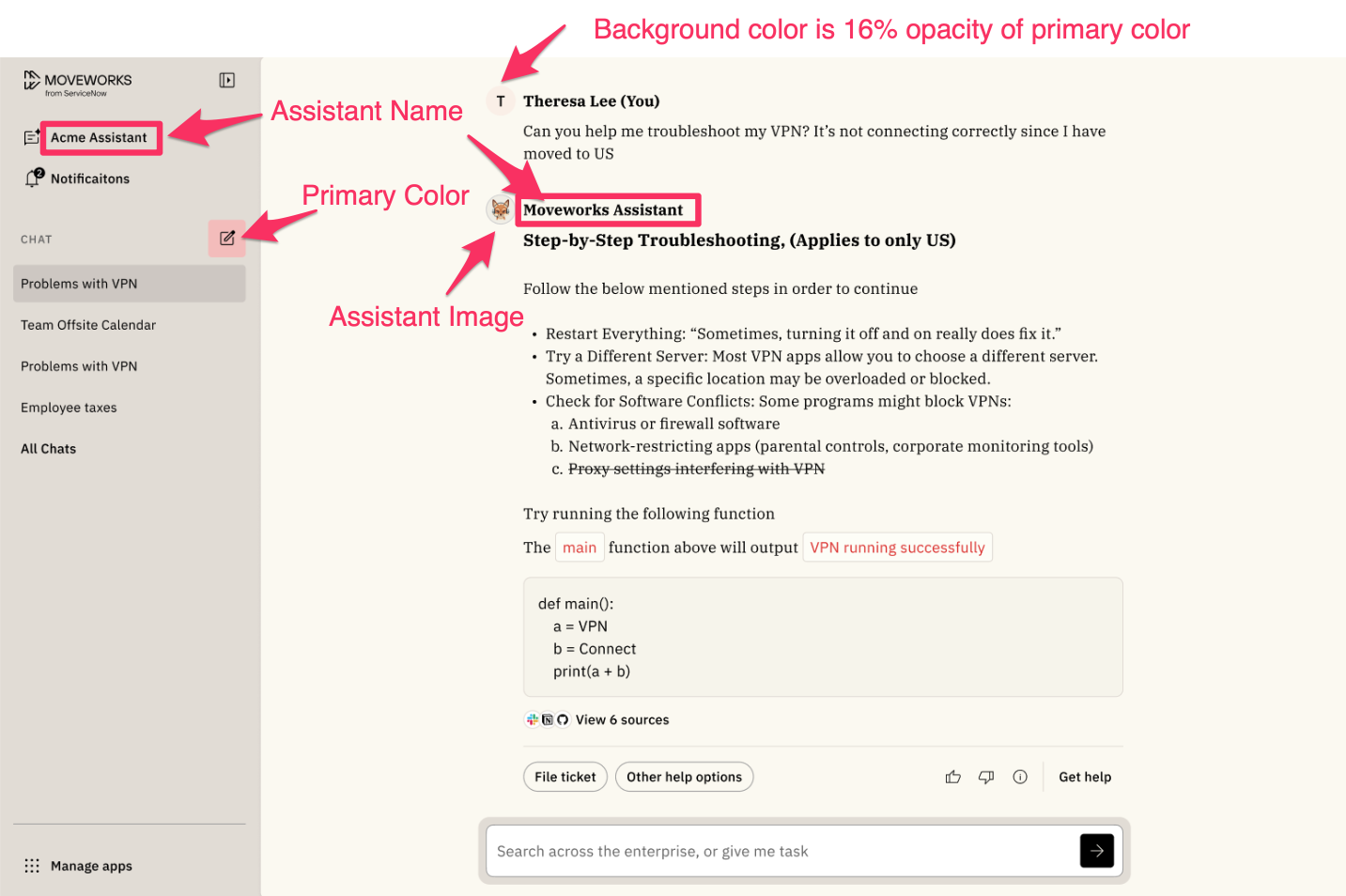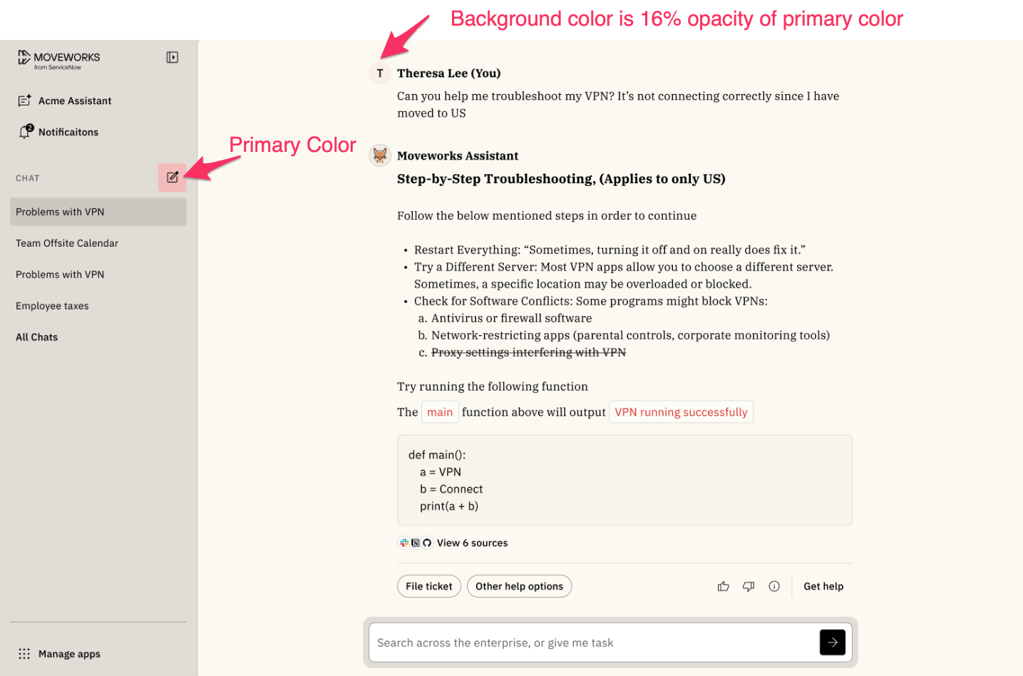 Web interface highlight color:Modifies the Moveworks reference page which is shared across all platforms (Slack, Microsoft Teams, Assistant on web, etc.)
