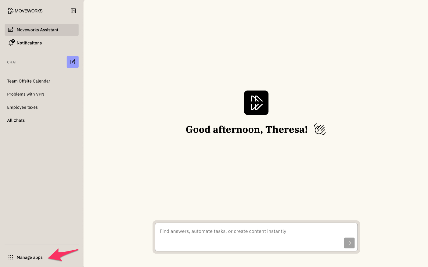 org_name.moveworks.com/assistantℹ️ Note: As part of the Assistant on Web launch, the default landing page experience has changed. Previously, this URL opened the My Moveworks stakeholder experience (a page that displayed entry points to your stakeholder applications like Agent Studio). We’ve intentionally updated this behavior so that all users now land directly in the Assistant experience, reflecting our focus on making the AI Assistant the central hub of work. Stakeholder applications remain accessible from new landing assistant page, via “Manage Apps” within the left nav.