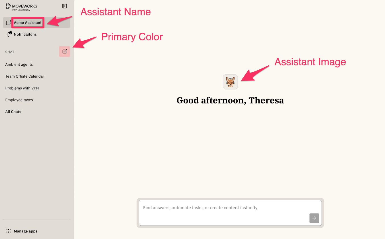 Assistant on Web will automatically inherit your organization’s existing Assistant branding settings from Moveworks Setup. This help ensures a consistent experience across all platforms (ex. Slack, Teams, and Web) without requiring you to reconfigure your Assistant’s appearance.