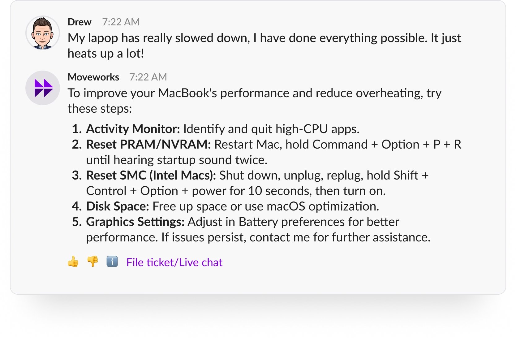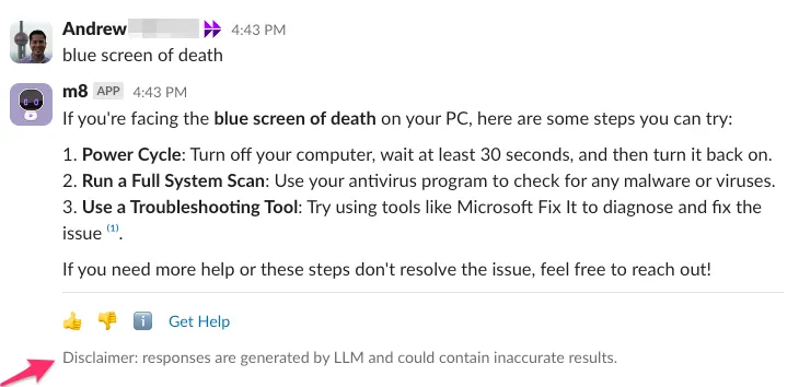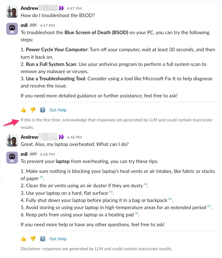 In addition to having a persistent message on every assistant response, you can have the first message be unique. Message shown to a user the first time they ask the Moveworks AI Assistant a question. This will be a one-time message that will be appended to the end of the Moveworks AI Assistant’s response in chat