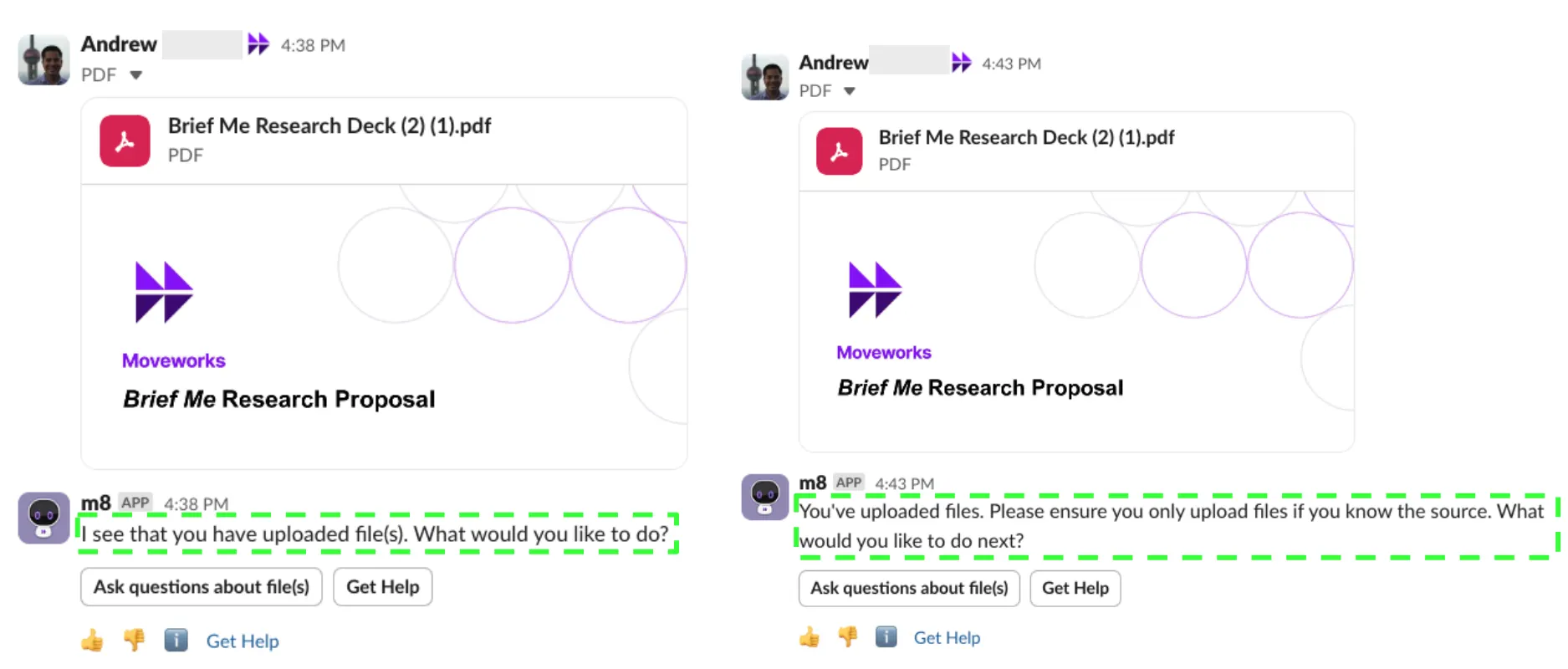 By default the message is "I see that you have uploaded file(s). What would you like to do?" . This can be overwritten completely as shown on the right image.