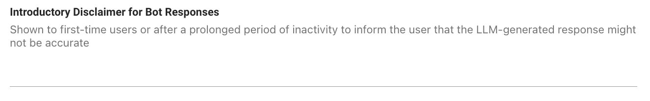 Introductory Disclaimer for Bot Responses - Provide the text for the new field. A maximum of 25 characters is supported.