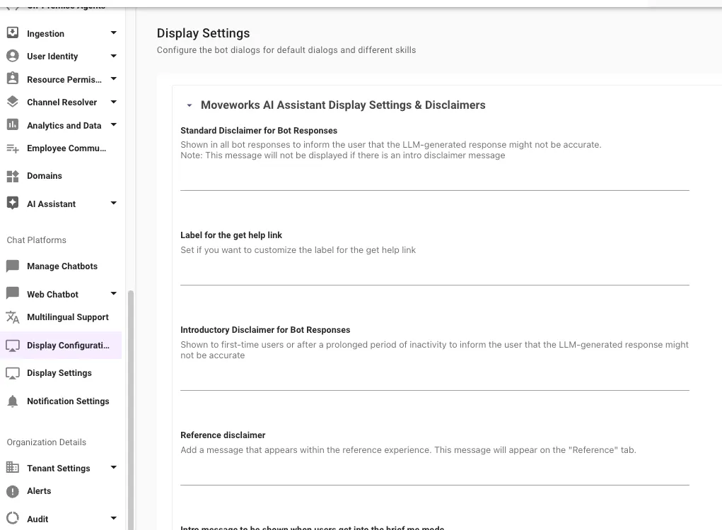To make these configurations, please navigate to “Display Configurations” within Moveworks Setup and expand the “Moveworks AI Assistant Display Settings” & Disclaimers section .