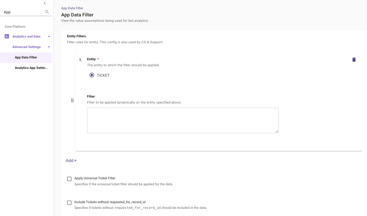 Navigate to Analytics & Data > Advanced Settings > App Data Filter under the Core Platform module.