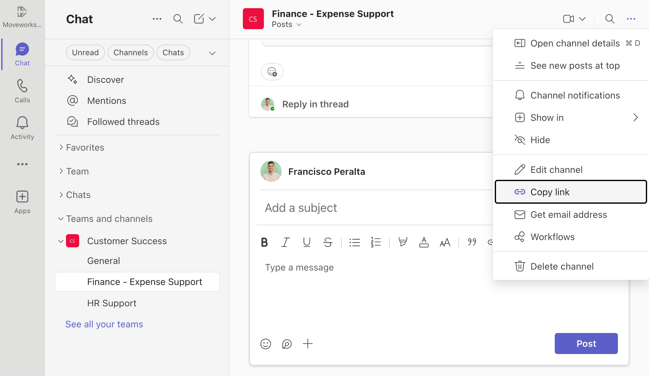 To find your Channel ID, go to the channel that you would like to enable live agent chat for and click ... then Click Copy link.