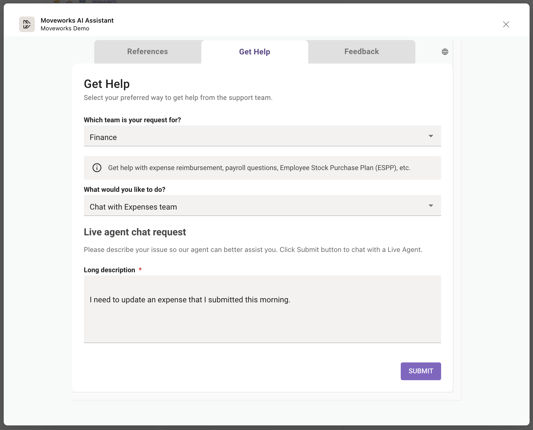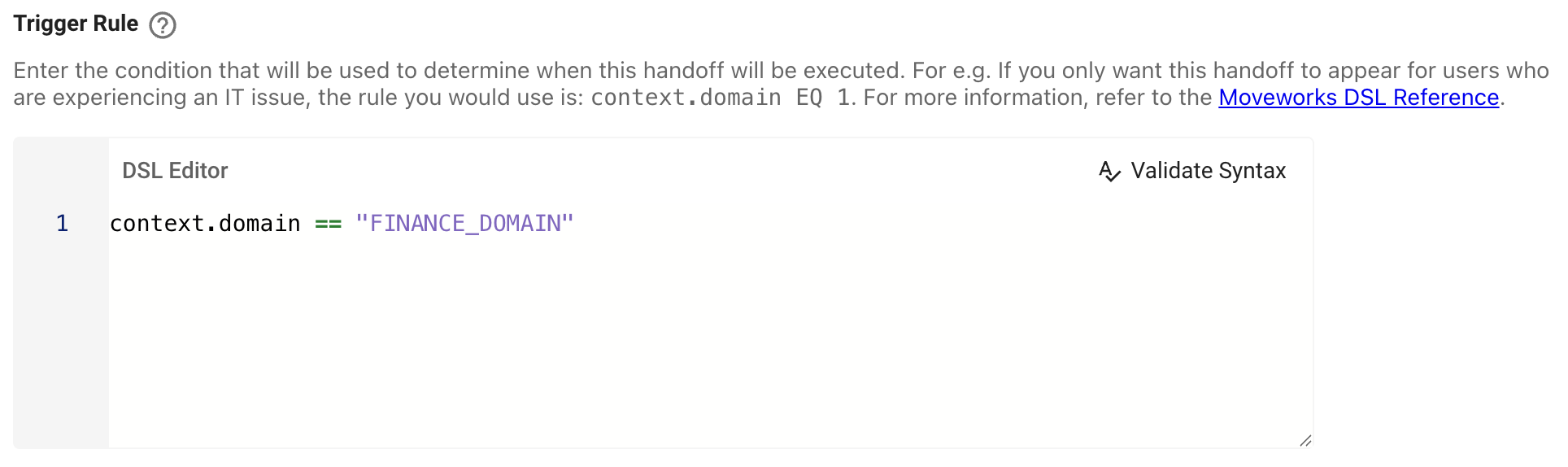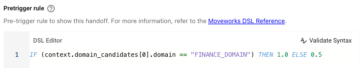 For example, set to context.domain == "FINANCE_DOMAIN" if this handoff should appear for users experiencing a Finance-related issue.