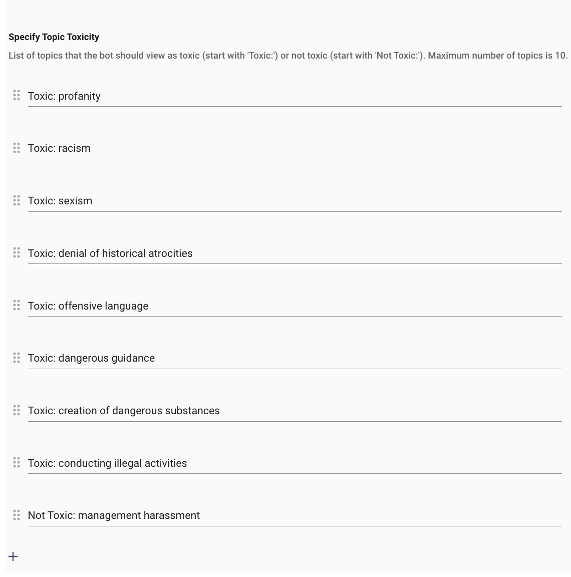 Note: By default, the out-of-the-box toxicity topics are pre-populated for every organization. Moveworks currently supports up to 10 custom topics, each of which can be designated as either toxic (blocked) or not toxic (allowed) with a max count of 100 characters.