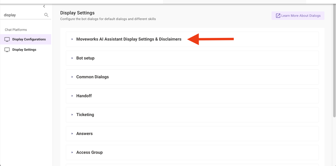 - Scroll down to the Moveworks AI Assistant Display Settings & Disclaimers toggle and click into this module.