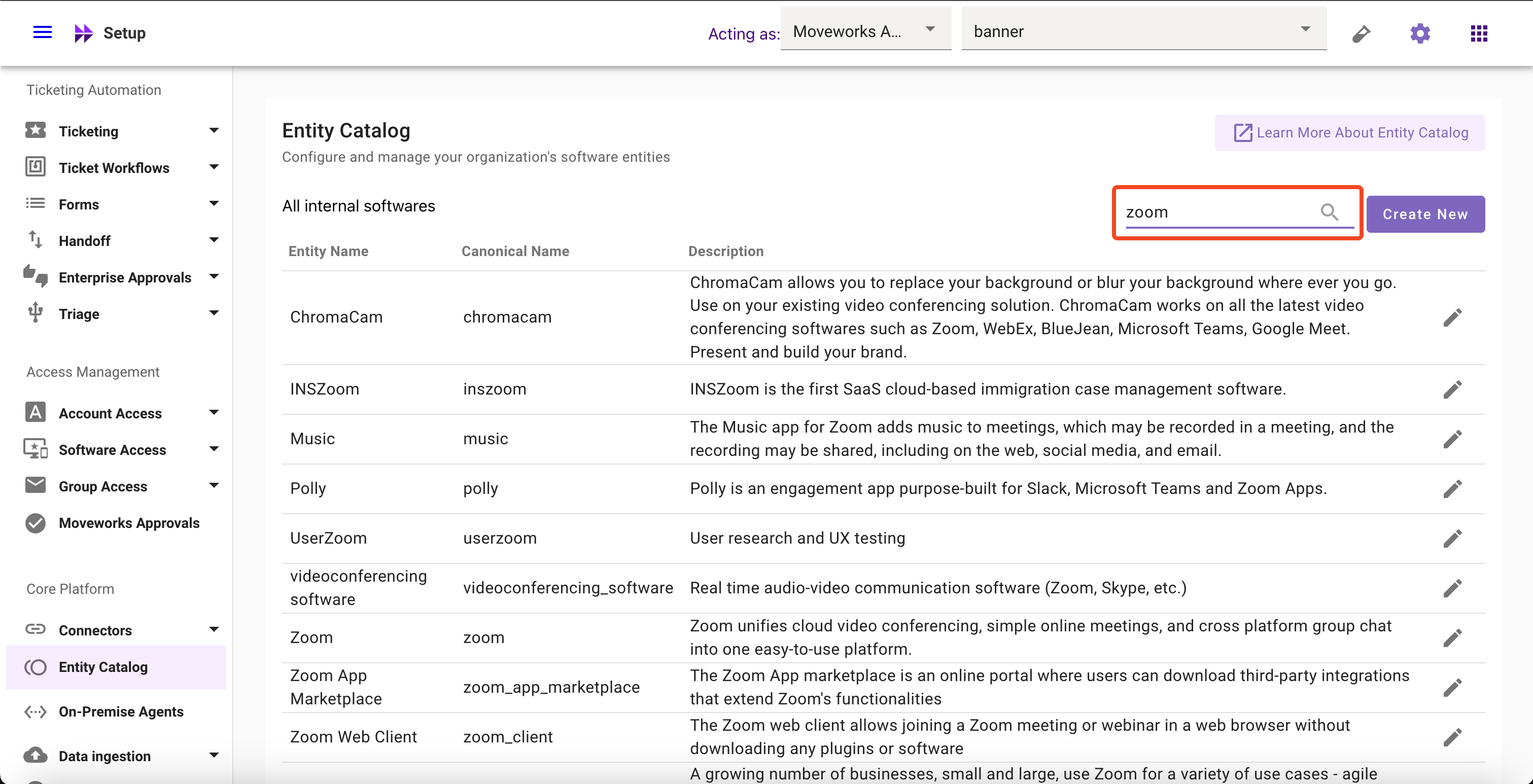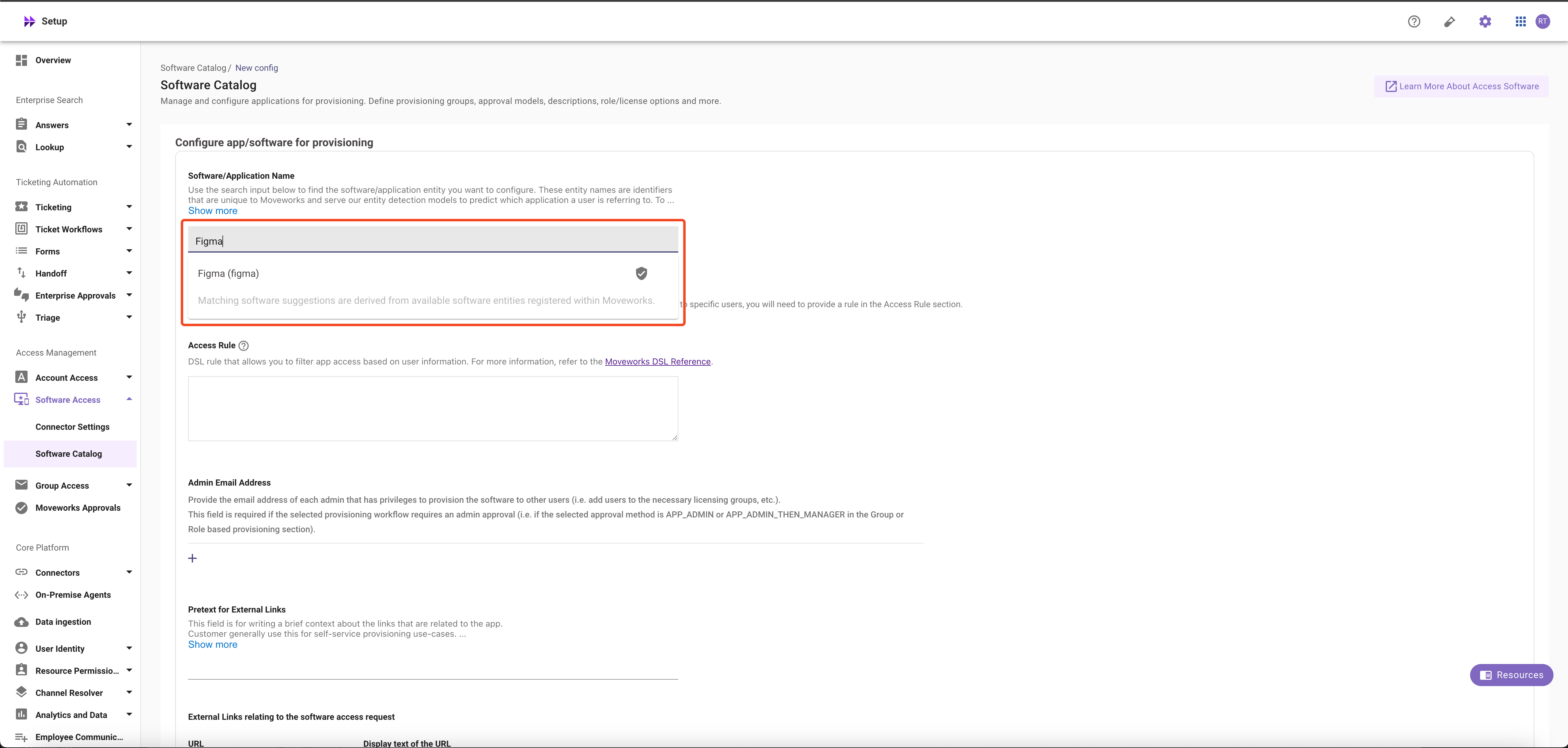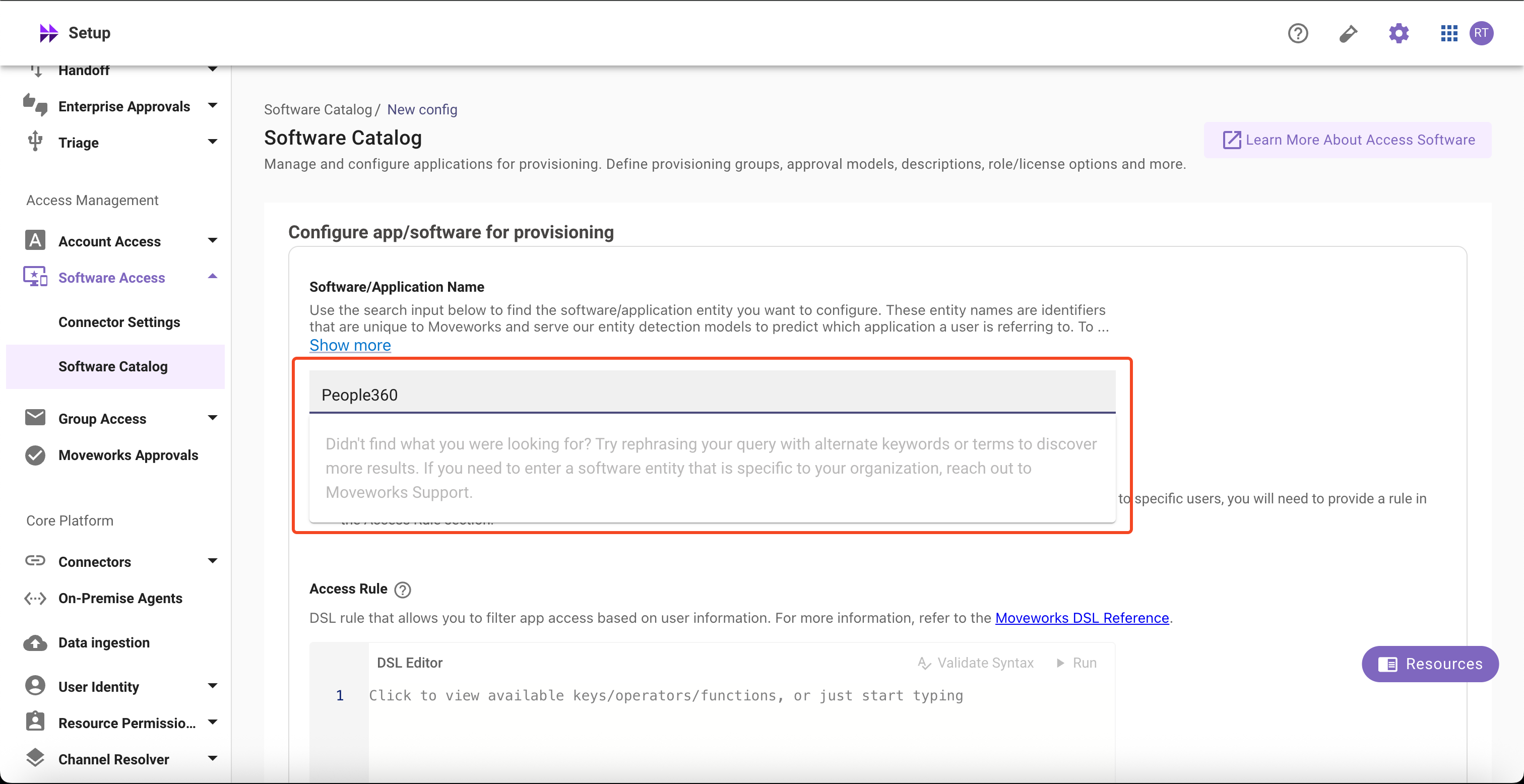 Search whether the software entity already exists Moveworks Setup > Access Software > Software Catalog > Software/Application Name