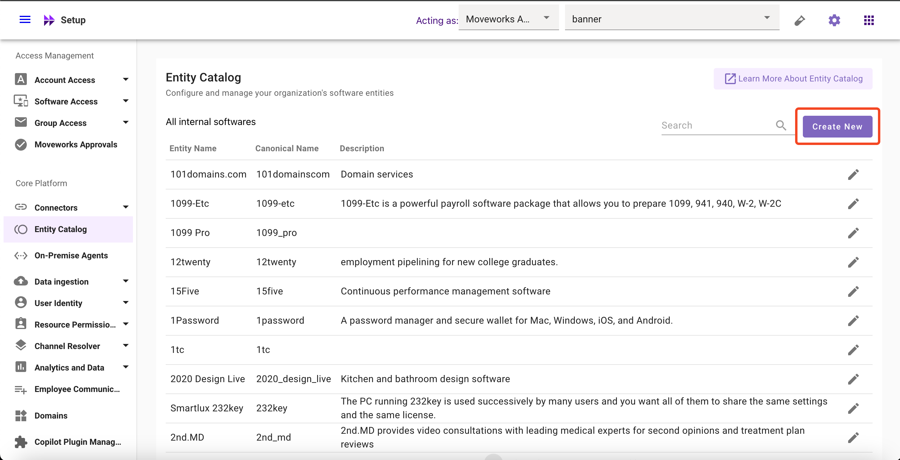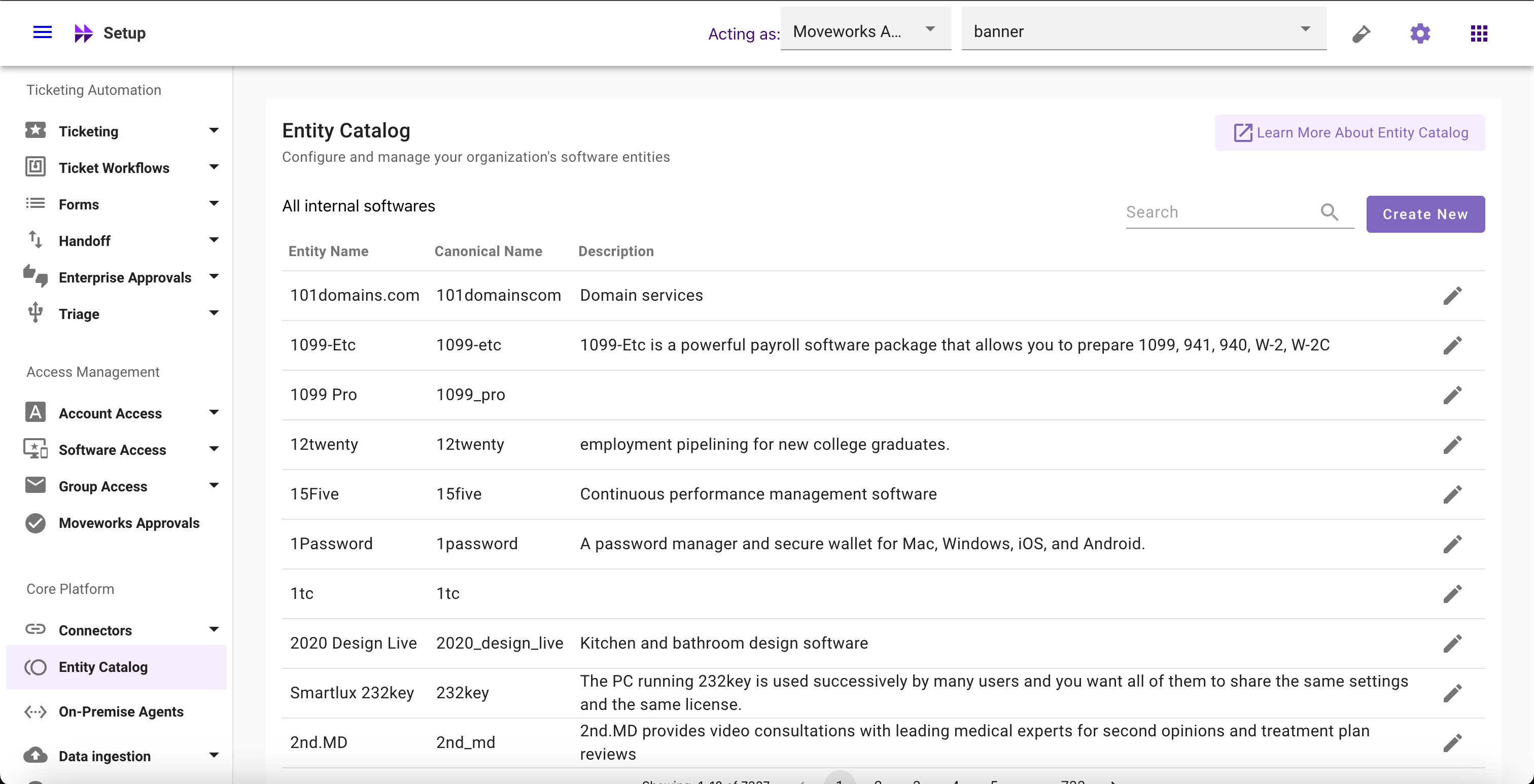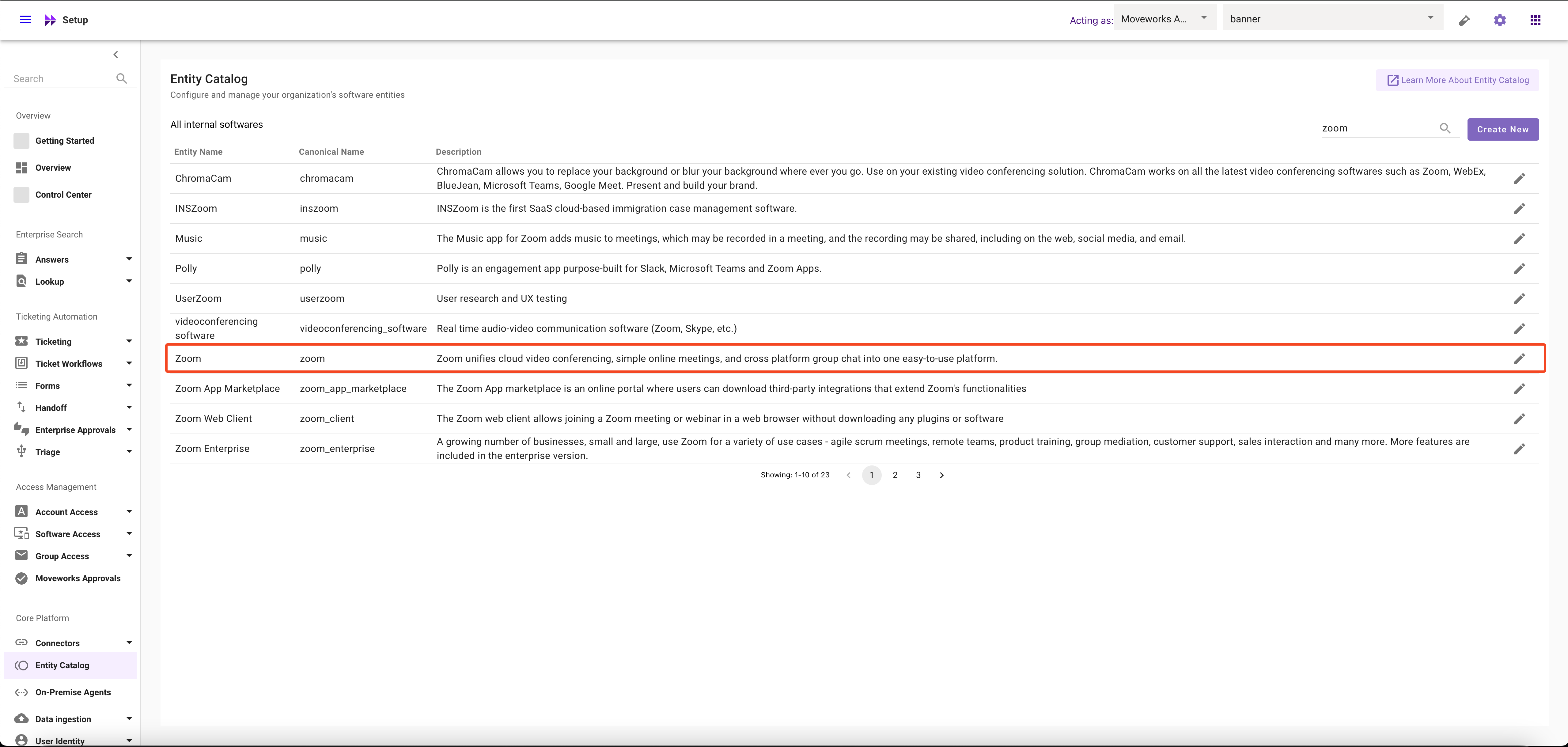 Search whether the software entity already exists Moveworks Setup > Access Software > Software Catalog > Software/Application Name