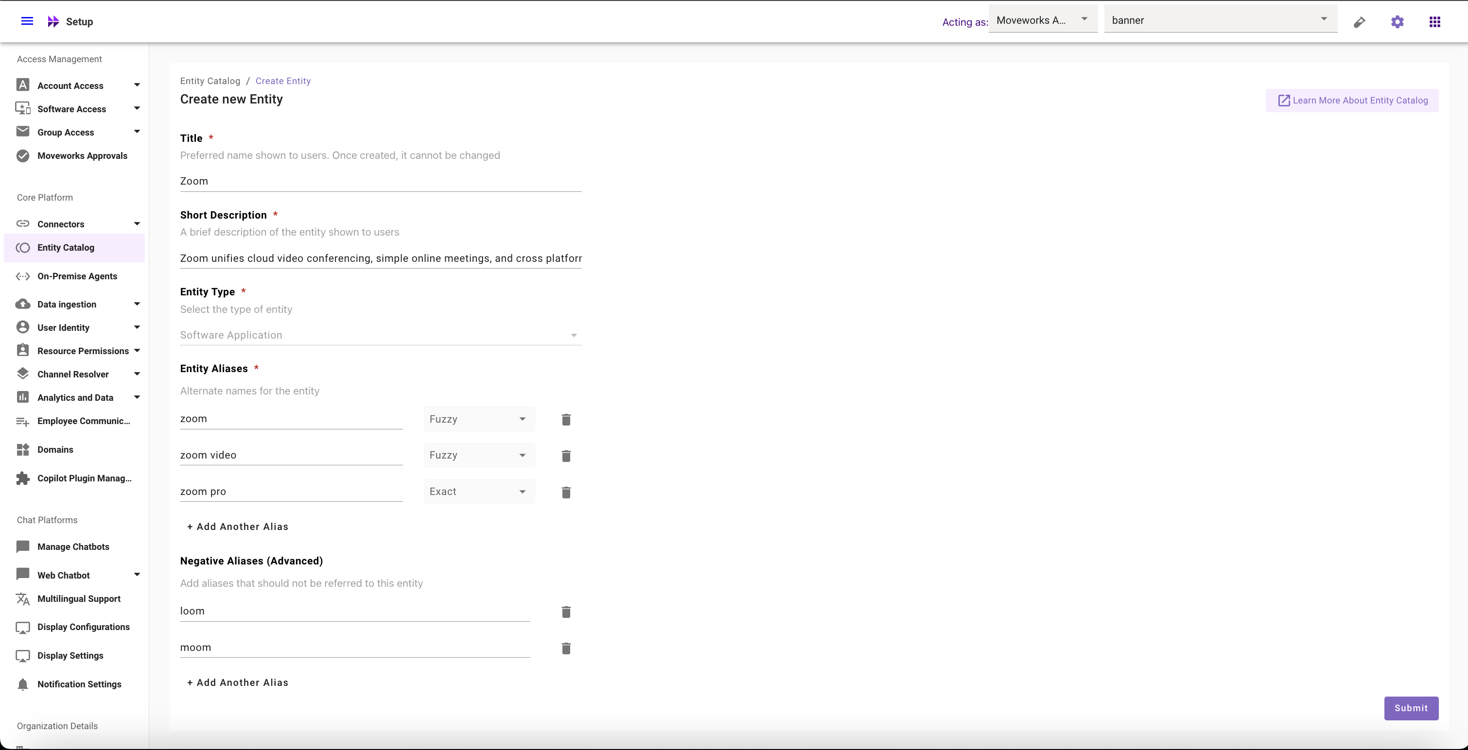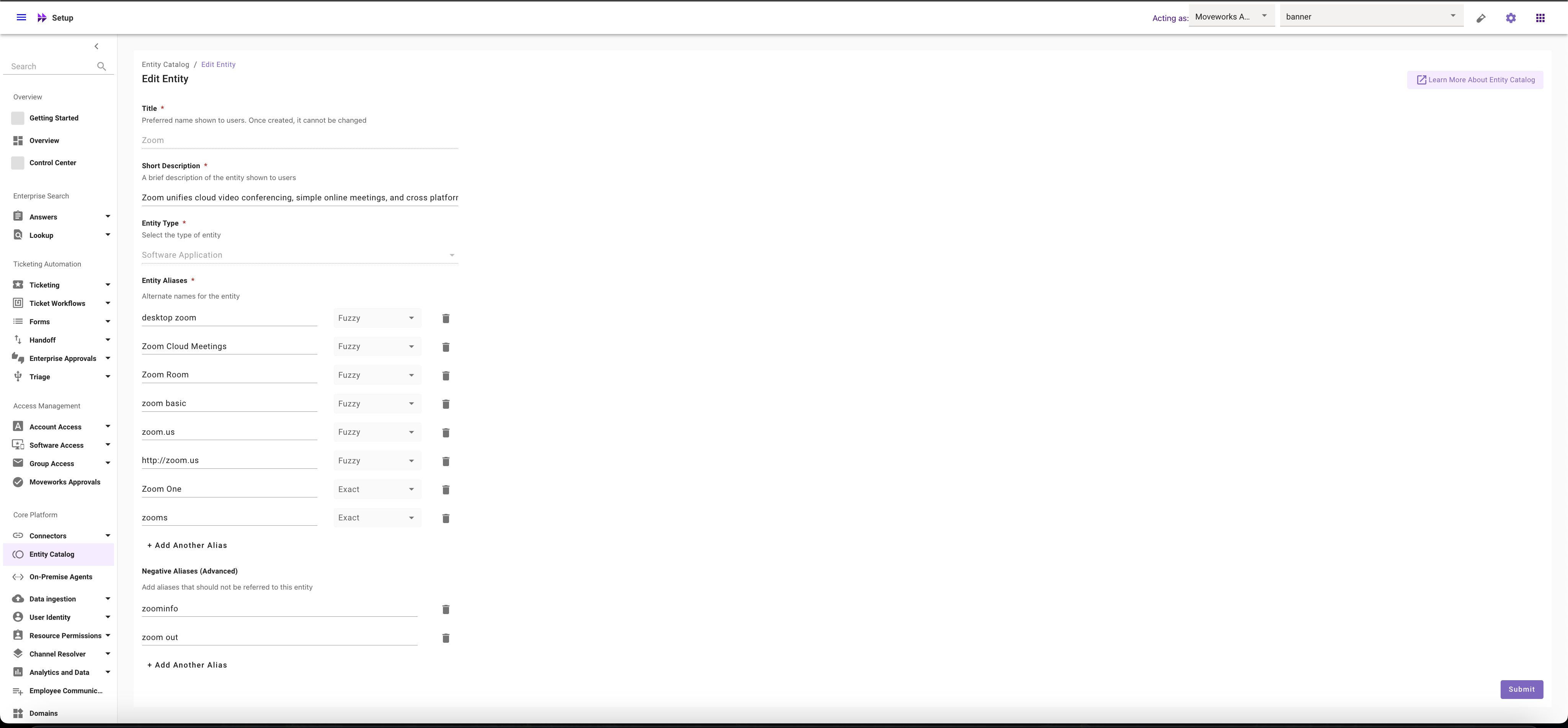 Navigate to Moveworks Setup > Core Platform section > Entity Catalog screen to view custom software entities