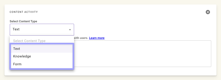 Content Activities are a type of process block that displays information to users rather than executing actions in external systems. They allow you to surface relevant content—such as knowledge articles, forms, or formatted text—at key moments in a conversation workflow.