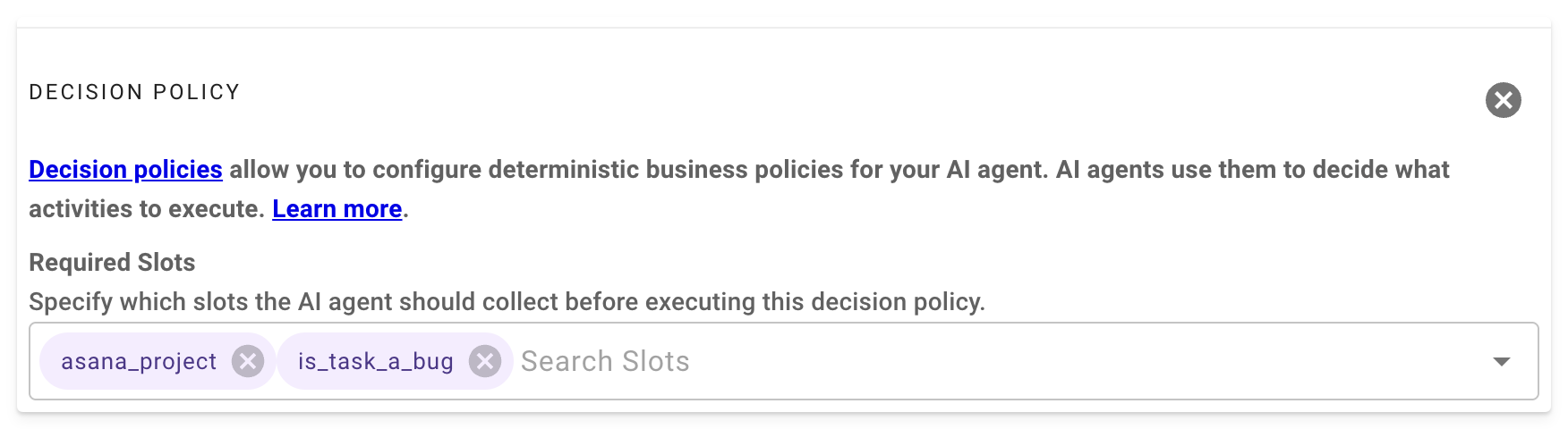 Specify the slots that must be collected before evaluating the decision policy. These ensure the AI has the necessary data to make informed decisions.