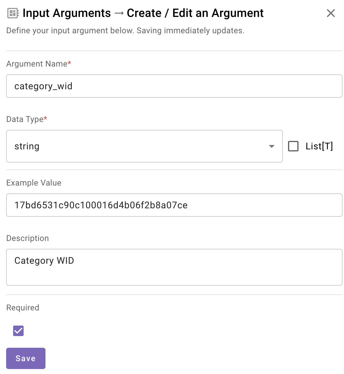 Copy that value and paste it into the "Example Value" field. This is the variable that will be passed into the XML and ultimately the API. Also ensure you provide a clear description - this is so that the reasoning engine understands what this is. Click "Required" and "Save".