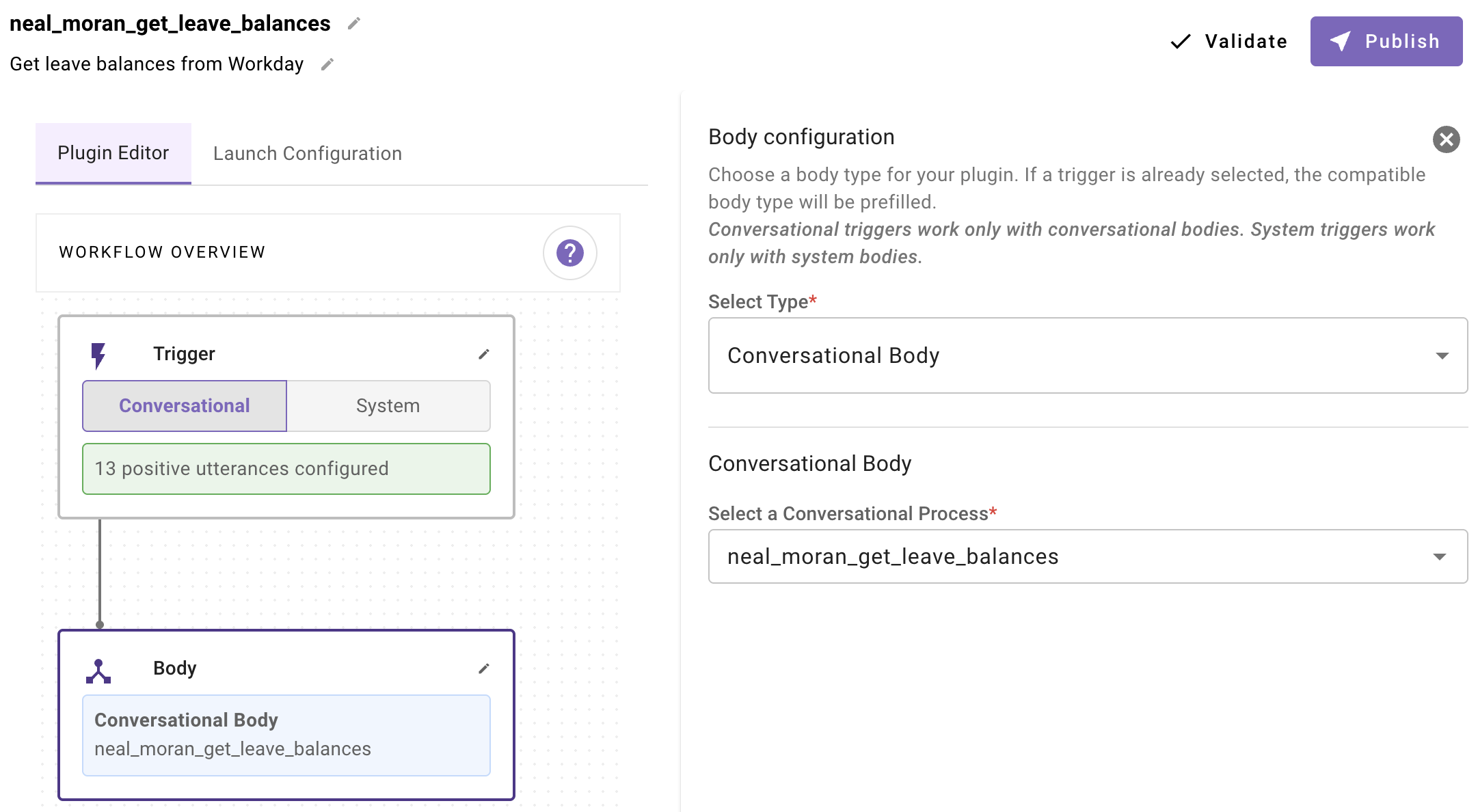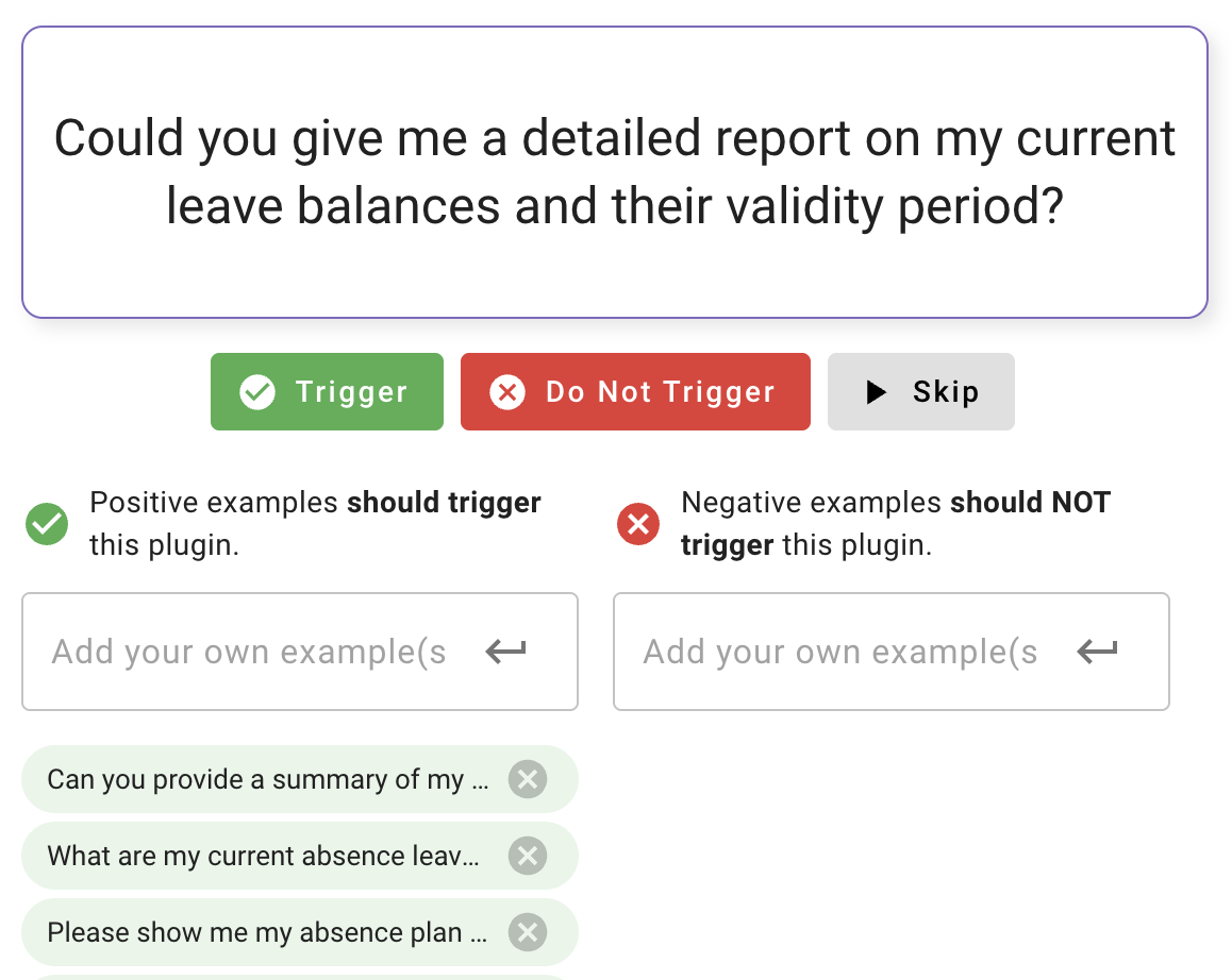 On the “Plugin Editor” tab, click the “Conversational” tile in the "Trigger" block. On the right you will see a dialog to provide examples of utterances that should trigger this plugin.