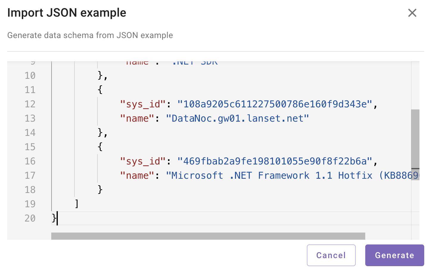 Now we will set up the Schema. The Schema tells Moveworks how the object is expected to be represented when it comes back from the HTTP Action so it can reference the values correctly when referring to it. Agent Studio can create a schema from example JSON payloads. Copy the payload below - this payload is representative of the "Get CI By Name" HTTP Action you build earlier.