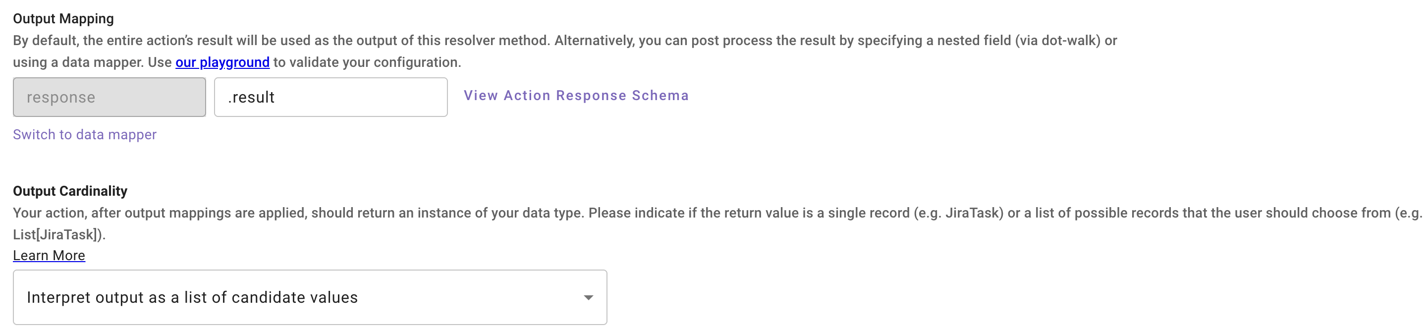 Scroll down to the “Output Mapping” section. Under “Output Mapping”, you’ll see an area to map the output. This is telling the Data Type where the payload of the actual records begins. Often this will be the root element- (in which case would be blank, however with ServiceNow their payload is a little different. You’ll that the payload array starts at result. Since we only care about the records, we will tell it the actual payload is in the “result” field, so this will be “.records”. For “Output Cardinality” - make sure you choose “Interpret output as a list of candidate values”. This is telling the Data Type to expect an array of records, since one or more configuration items could come back as a result of the search.