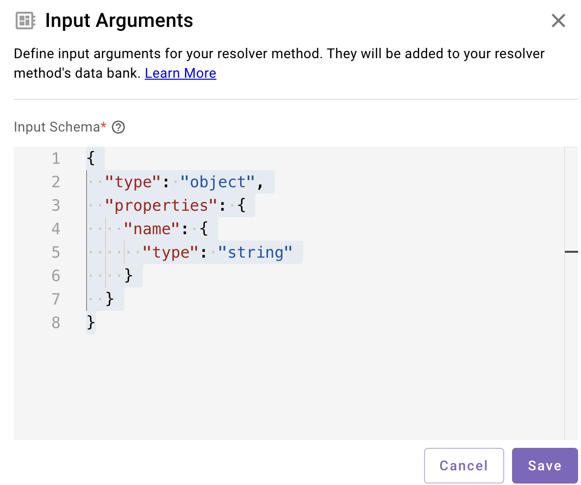 The way to do this is by clicking “Input Args” - you’ll find this at the top right of the resolver section. Once you click it, paste the following into the schema section.