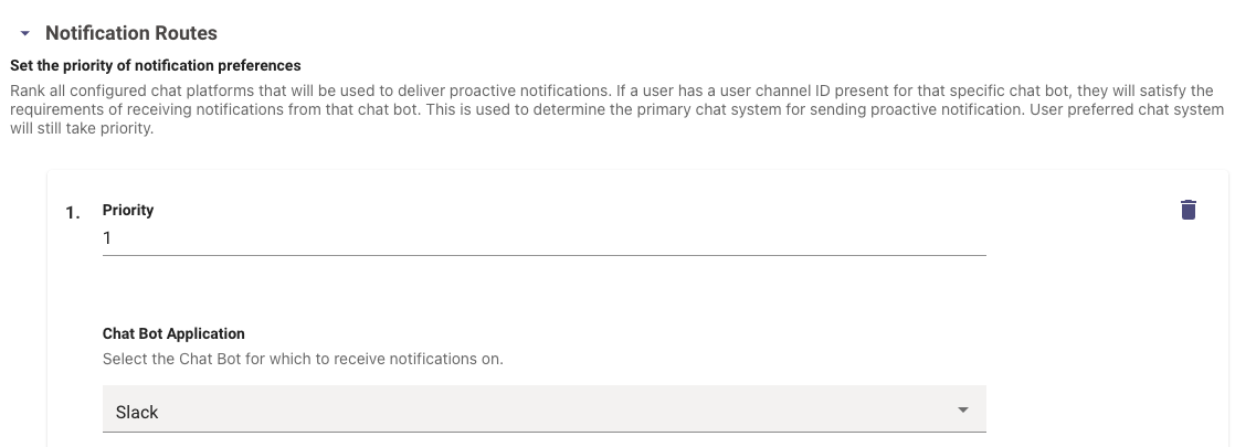 As a final step, once the chat configuration has been submitted, navigate to Notification Settings and add the new chatbot under Notification Routes.