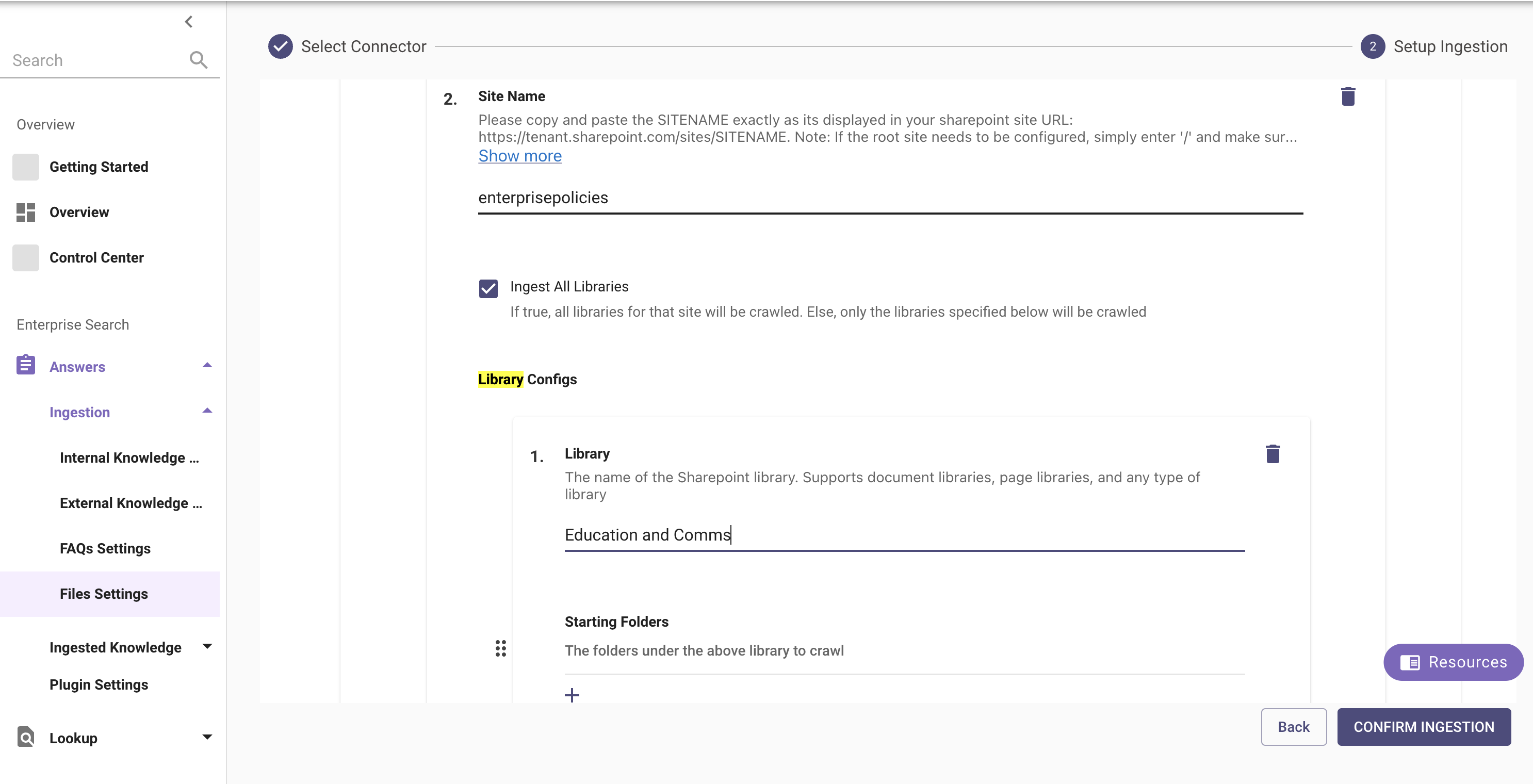 - Navigate back to File Knowledge, select the integration where you are missing resources from ingestion, click through to Ingestion Setup, and double check that you have named the Site correctly.