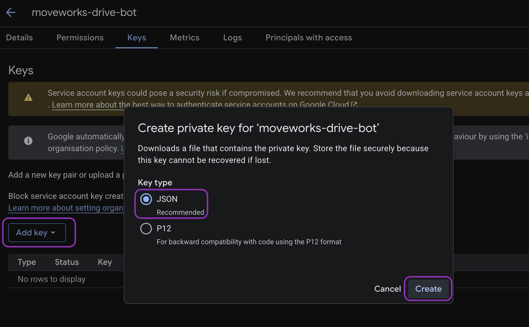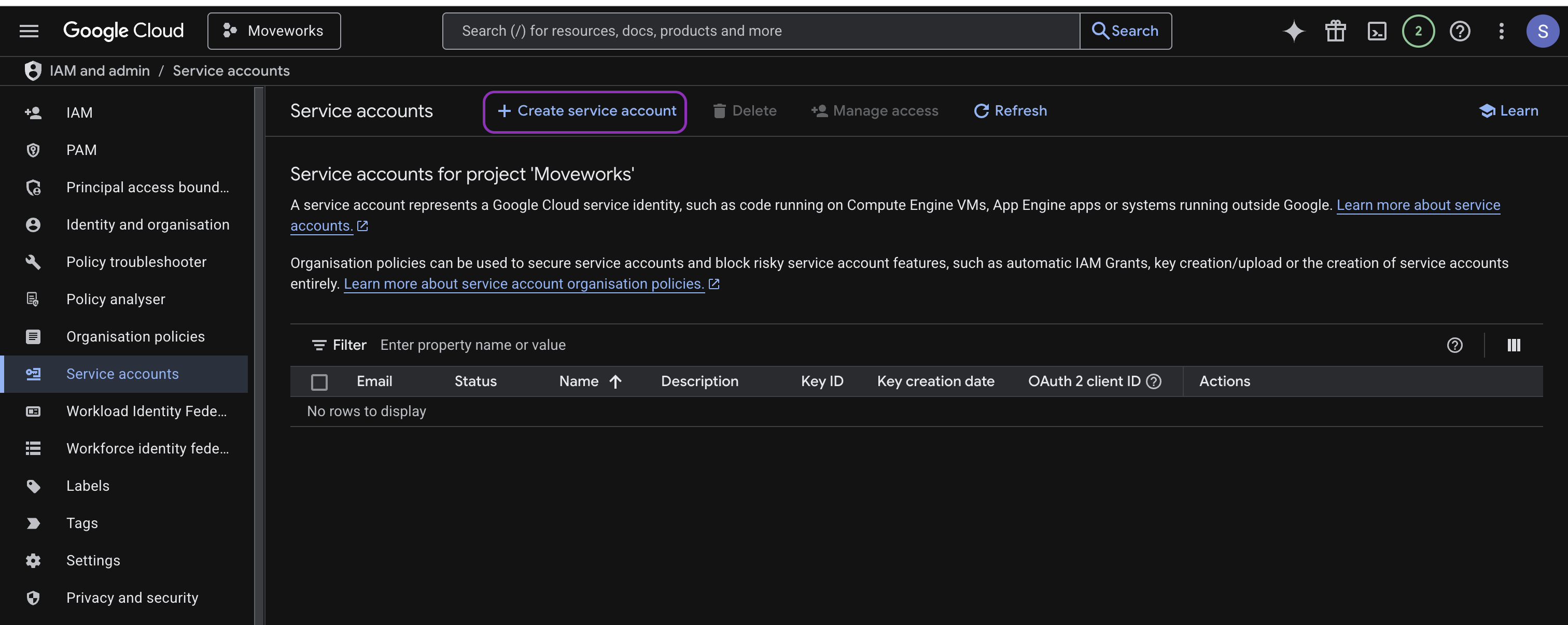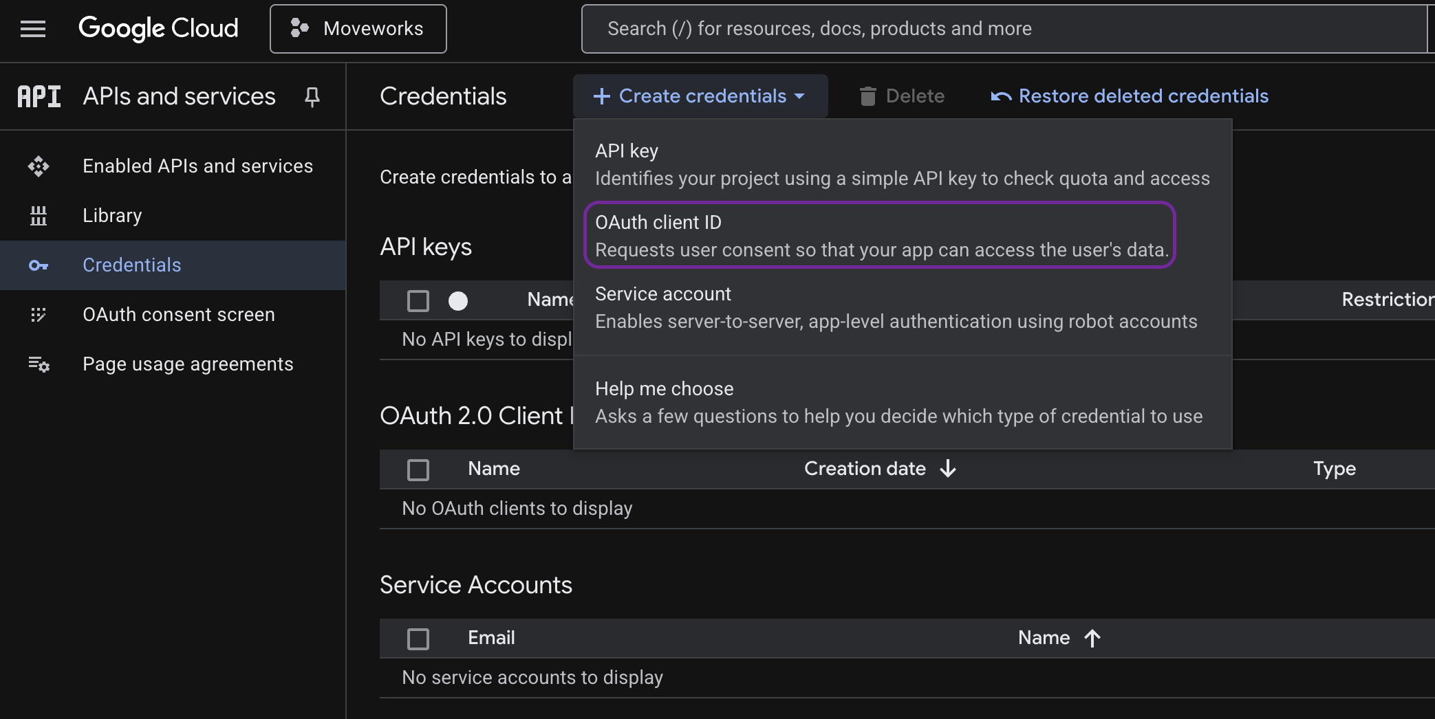 Depending on your authentication method, you’ll generate either an OAuth 2.0 Client or a Service Account key.
