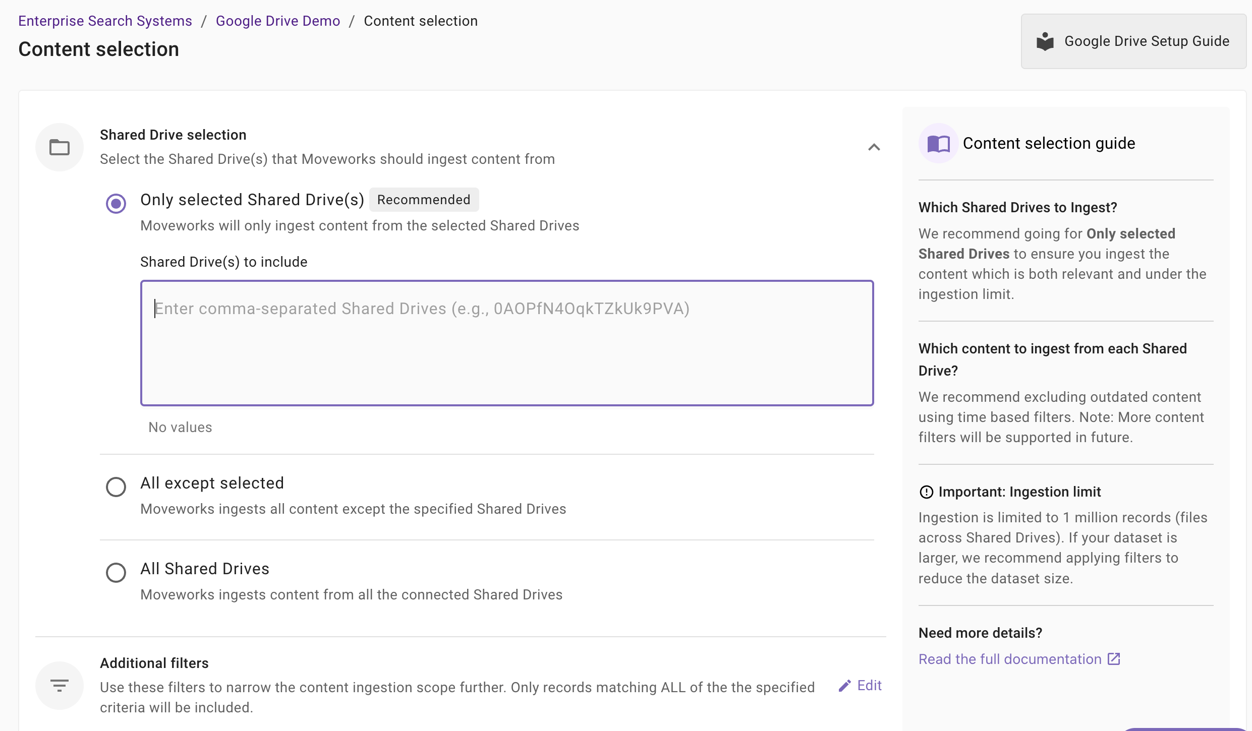 - Only content from Shared Drives (explicitly shared with the Service Account) is ingested.