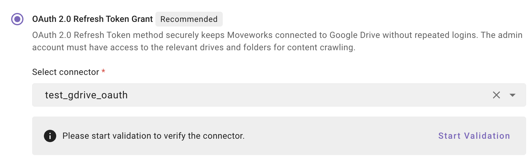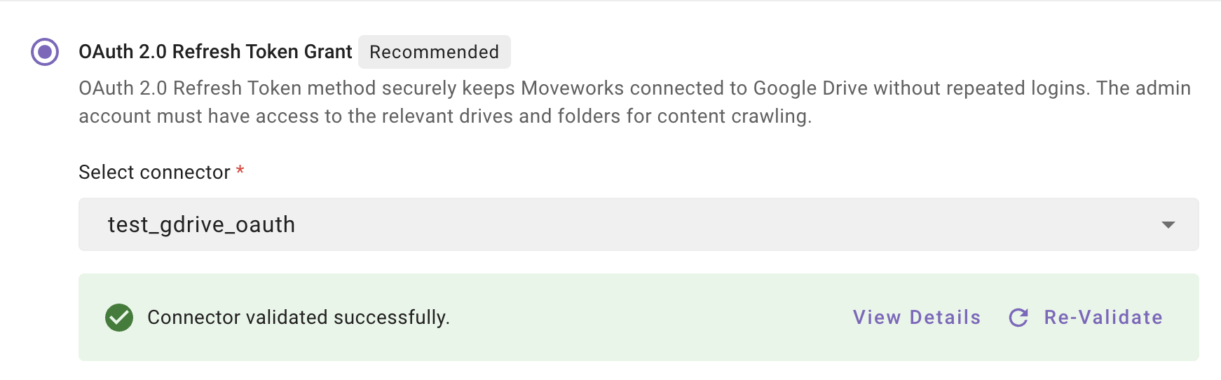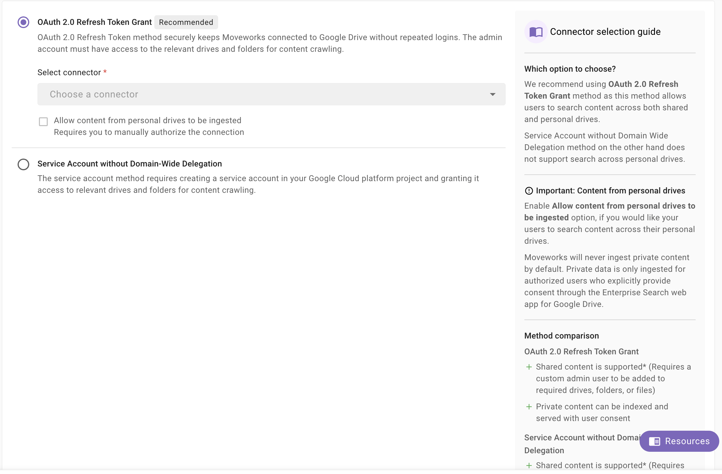 Moveworks supports two authentication methods. You will configure one Moveworks Google Drive connector using either method based on your requirements.